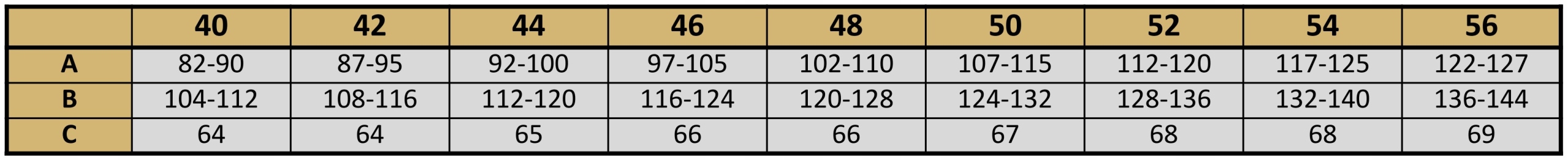 B - Обхват стегон (вимірювання, наведене в таблиці, є діапазоном, коли матеріал розтягується)