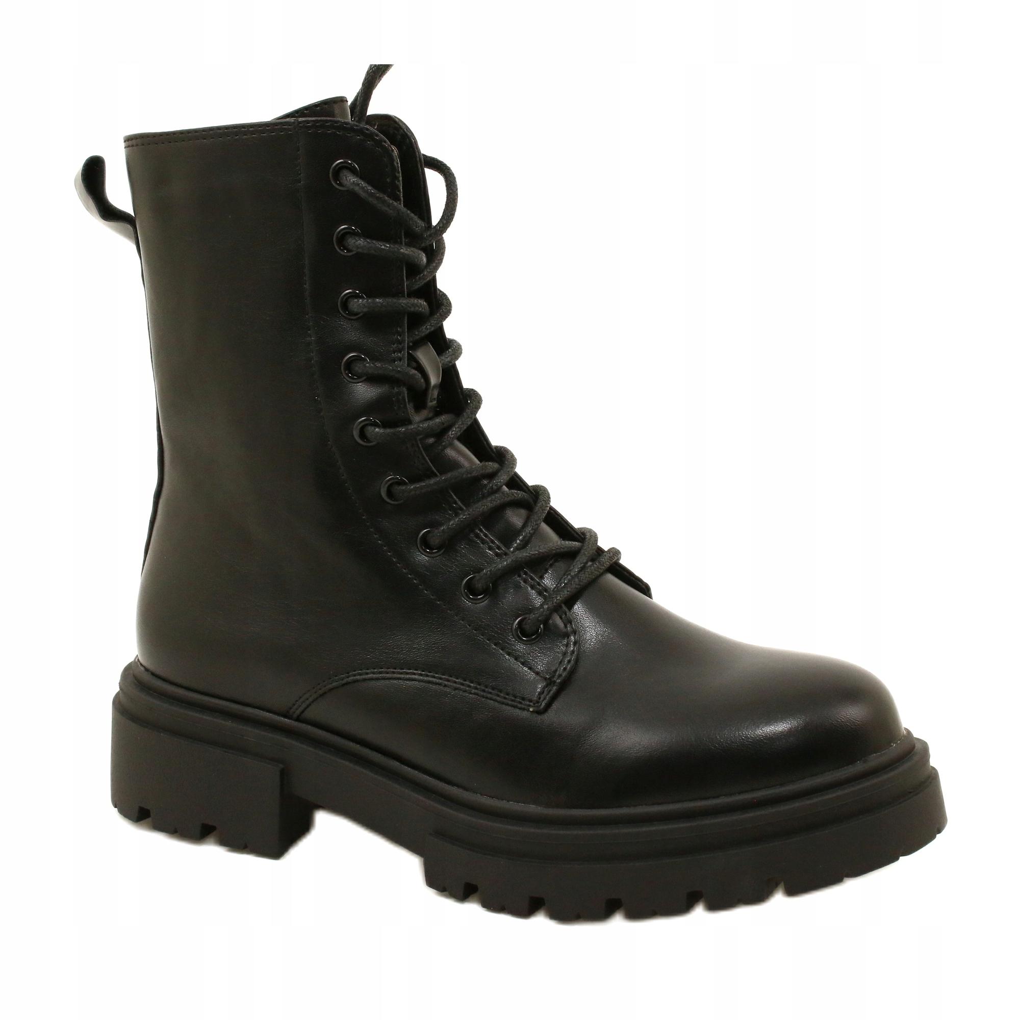 Чорні високі чоботи - це жіноче взуття на основі вуличних моделей, яке гарантує комфортний захист стопи в зимові дні. Синтетичний верх із швами висотою 17,5 см забезпечує стабільність і довговічність у складних погодних умовах. Високий верх і підкладка з ніжного і короткого матеріалу. хутро. Класична шнурівка стабілізує щиколотку, а бічна блискавка дозволяє швидше одягнути. Більш товста підошва з міцним протектором близько 3 см, добре ізолює від землі.