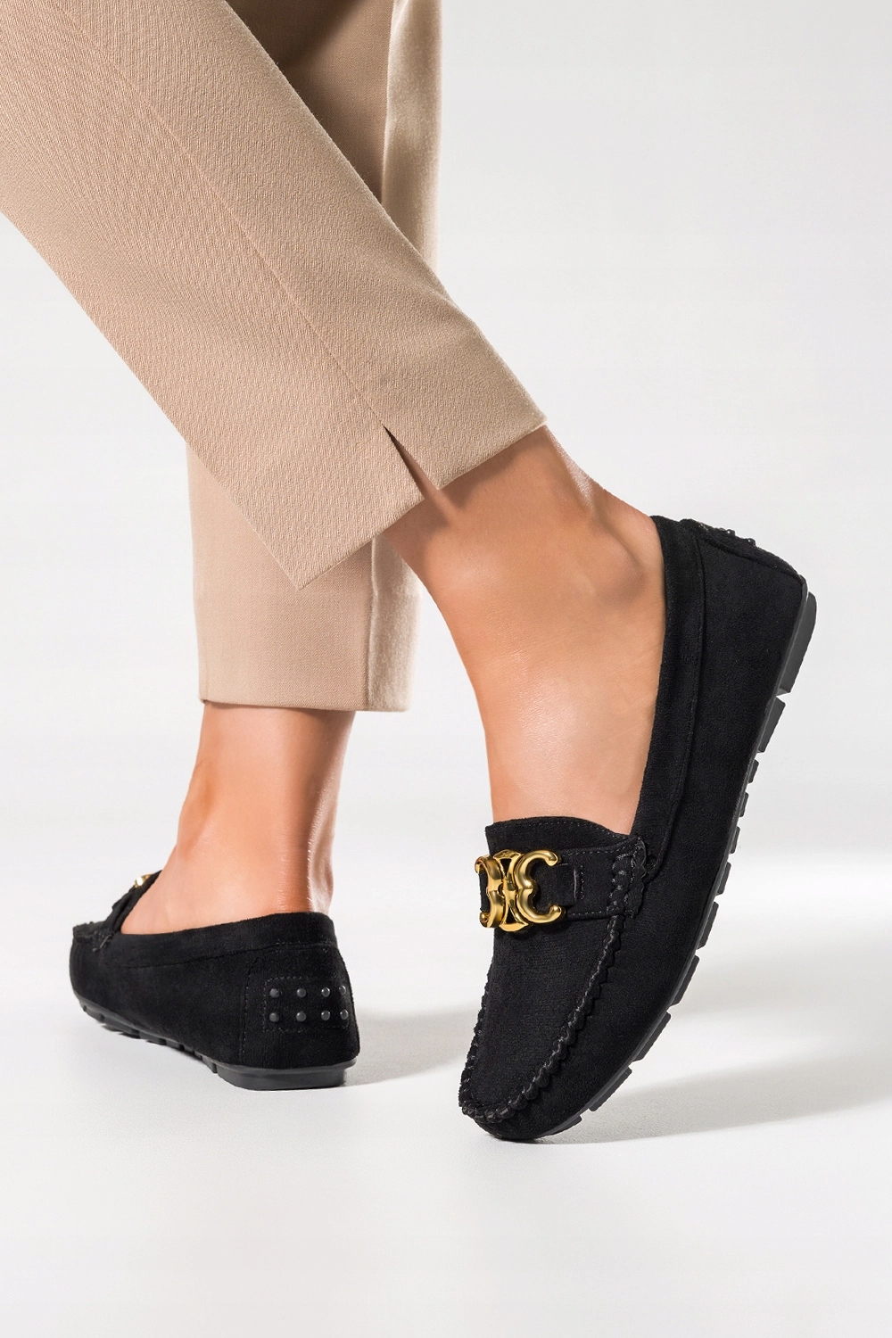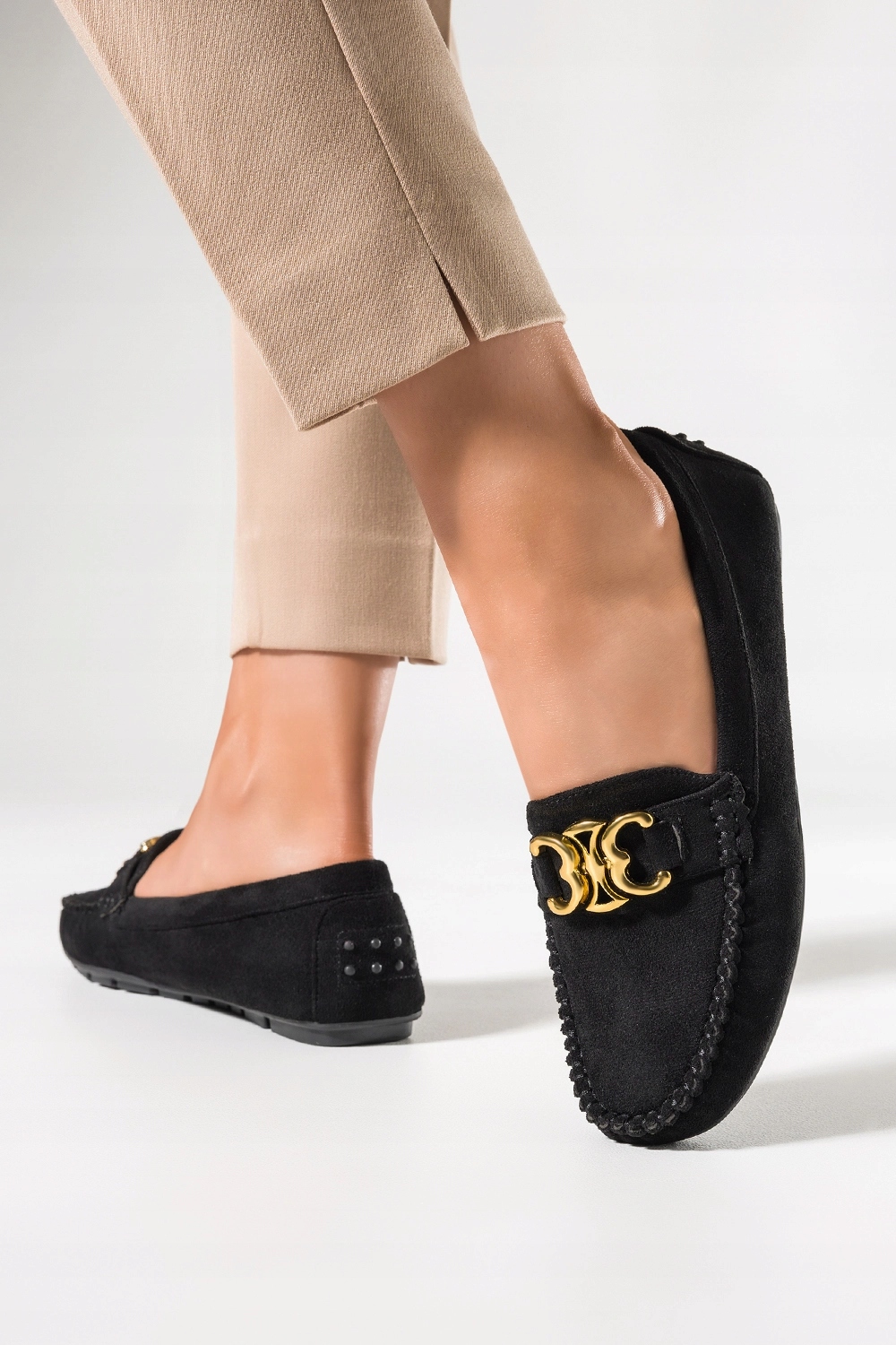 Чорні жіночі мокасини моделі D24X3-B виготовлені з якісної екологічної замші, що гарантує відмінну якість, комфорт і прилягання до ноги. Зробіть крок у світ класу та витонченості з нашими лоферами. Це справжній шедевр для кожної жінки, яка цінує елегантне та зручне взуття. Плоска підошва забезпечує комфорт протягом усього дня. Незалежно від того, блукаєте ви вулицями міста чи проводите день в офісі, наші лофери гарантують максимальний комфорт. Плоска підошва мінімізує навантаження на суглоби, що робить їх ідеальними для тих, хто постійно в русі. Сліпони легко взувати і знімати, що робить їх відмінним вибором для тих, хто цінує простоту і функціональність в одному. Шкіряна устілка адаптується до форми нашої стопи, забезпечуючи задоволення від ходьби. Золотий декор надає мокасинам неповторний шарм, це витончена деталь, яка надає їм додатковий клас і виділяє їх серед інших. Заокруглений кінчик не тільки модний, але й забезпечує додатковий простір для пальців, забезпечуючи повний комфорт під час носіння. Легкість цих мокасин створює відчуття, ніби ви крокуєте по хмарах. Вони є ідеальним супутником для довгих днів, повних активності. Сяйте з нашими унікальними мокасинами.