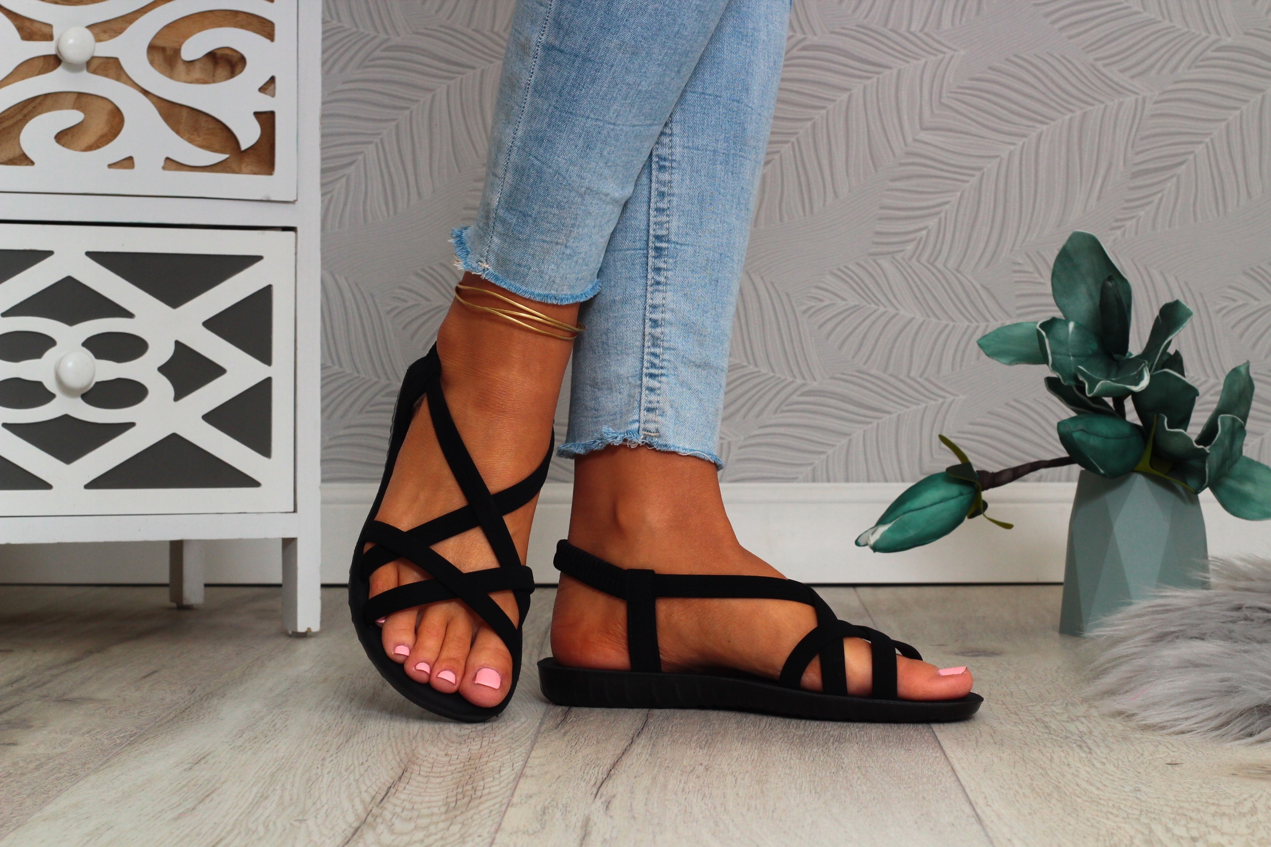Жіночі чорні босоніжки з рівним низом. Вони ідеально підходять як повсякденне взуття в спекотні літні дні. Простий дизайн також підійде до елегантних стилів, а декоративні кристали додадуть шарму багатьом стилям. Еластичний ремінець на п'яті полегшує взування та підгонку взуття до стопи.