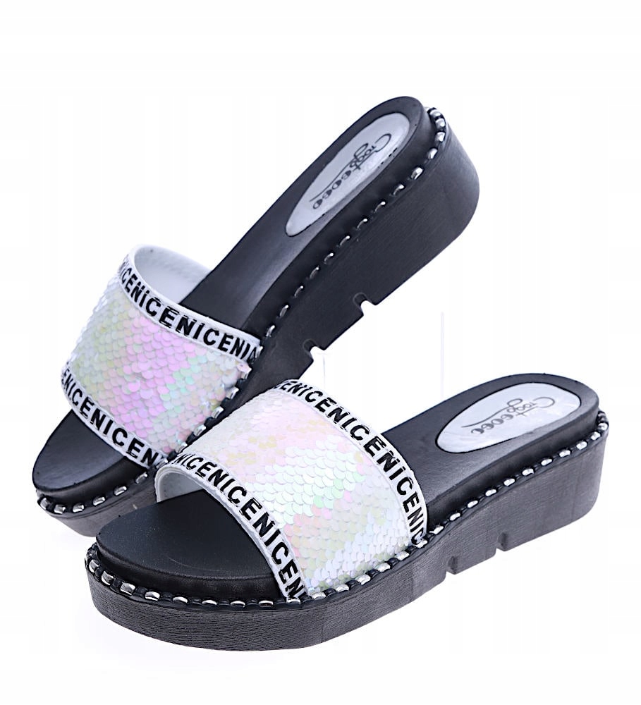 - Чорні жіночі шльопанці з мерехтливим верхом.