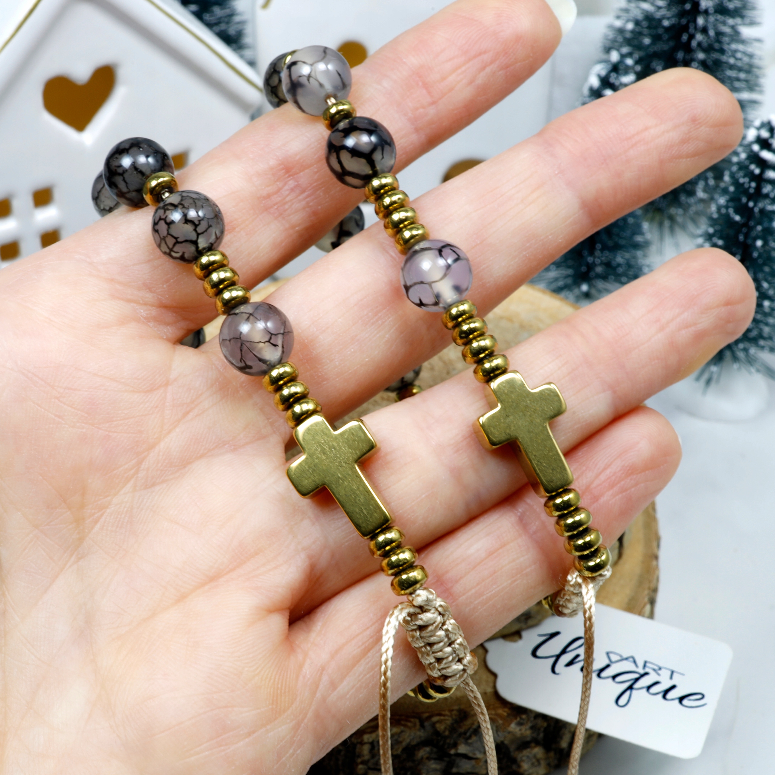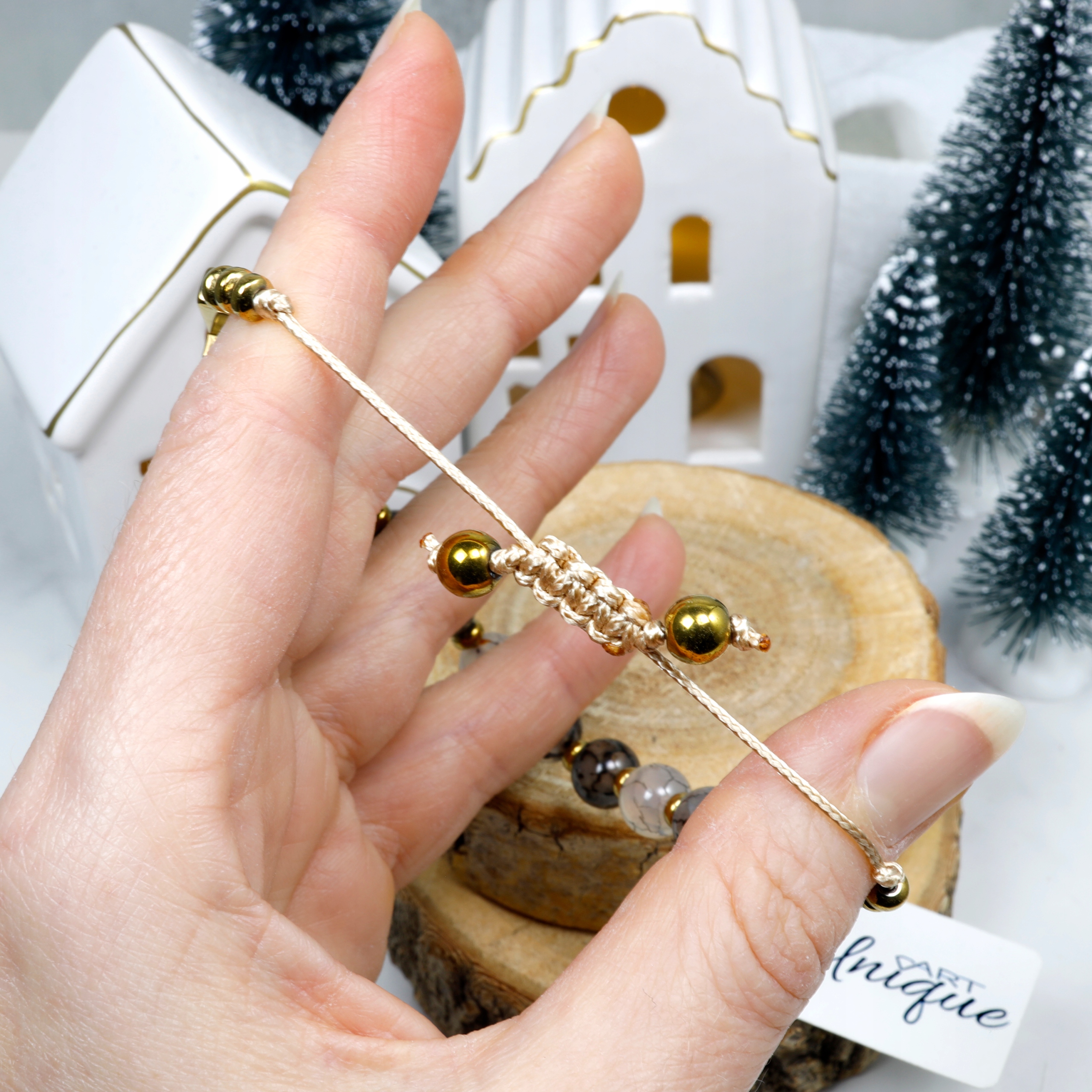 Обхват регулюється за допомогою вузла макраме, що полегшує надягання та зняття браслета та забезпечує зручну посадку на зап’ясті.