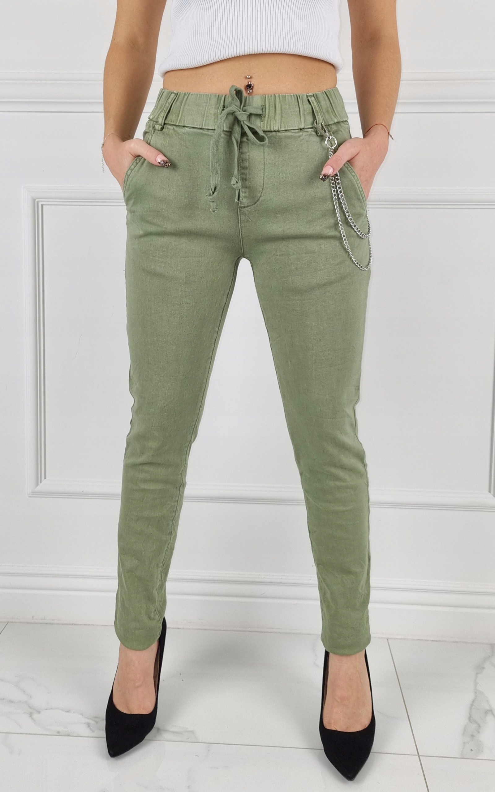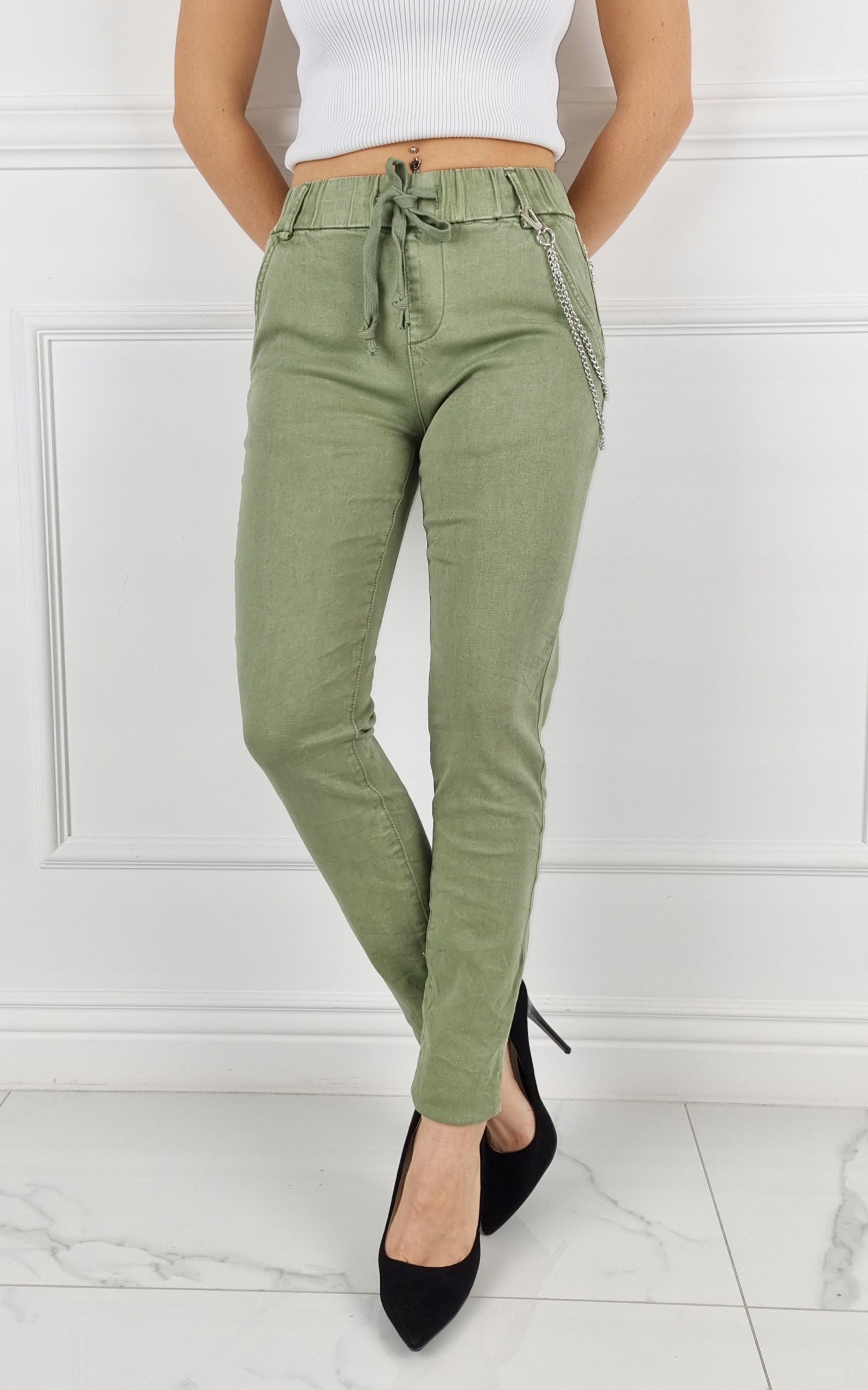 Чудові штани, мають середню талію. Чудово підходять для спортивного взуття, але вони також ідеальні в поєднанні з високими підборами, завдяки своїй універсальності вони підходять практично до будь-якого стилю. Гнучкий матеріал підкреслює жіночу фігуру. Штани приталені та стрейч. Підкресліть свої жіночі форми! Зробіть свій повсякденний образ унікальним. Штани мають кишені з обох боків.