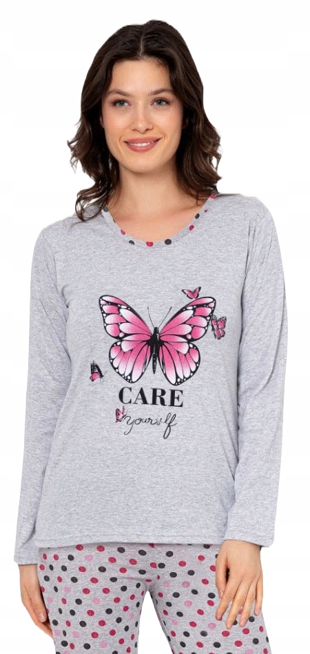 Футболка з довгими рукавами, декольте, оброблене окантовкою в колір штанів. Довгі штани з малюнком мають нетиснучу гумку. Піжама забезпечує високий комфорт при носінні вдень і під час сну. Купуючи цей товар, ви можете бути впевнені, що він найвищої якості. У наших стаціонарних магазинах ці піжами дуже задоволені покупцями. Рекомендуємо.