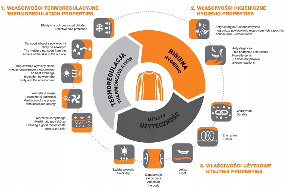Поєднання волокон натуральної вовни з поліамідними волокнами та використання двошарової безшовної конструкції забезпечили унікальні терморегуляційні властивості та максимальний комфорт. Продукт забезпечує швидкий збір вологи, значно підвищує тепловий комфорт і ефективно підтримує постійну температуру тіла. Захищає організм від переохолодження і перегріву. Засіб пройшов дерматологічне тестування - не подразнює і не викликає алергії, також підходить для алергіків. Мериносова вовна має додаткові оздоровчі властивості: мікромасаж її волокнами сприяє поліпшенню кровопостачання клітин, що покращує кровообіг, а нейтралізація позитивних іонів благотворно і заспокійливо впливає на нервову систему. Технологічно передовий продукт створено з увагою до найдрібніших деталей, завдяки тому, що він виготовлений на 100% у Європейському Союзі.