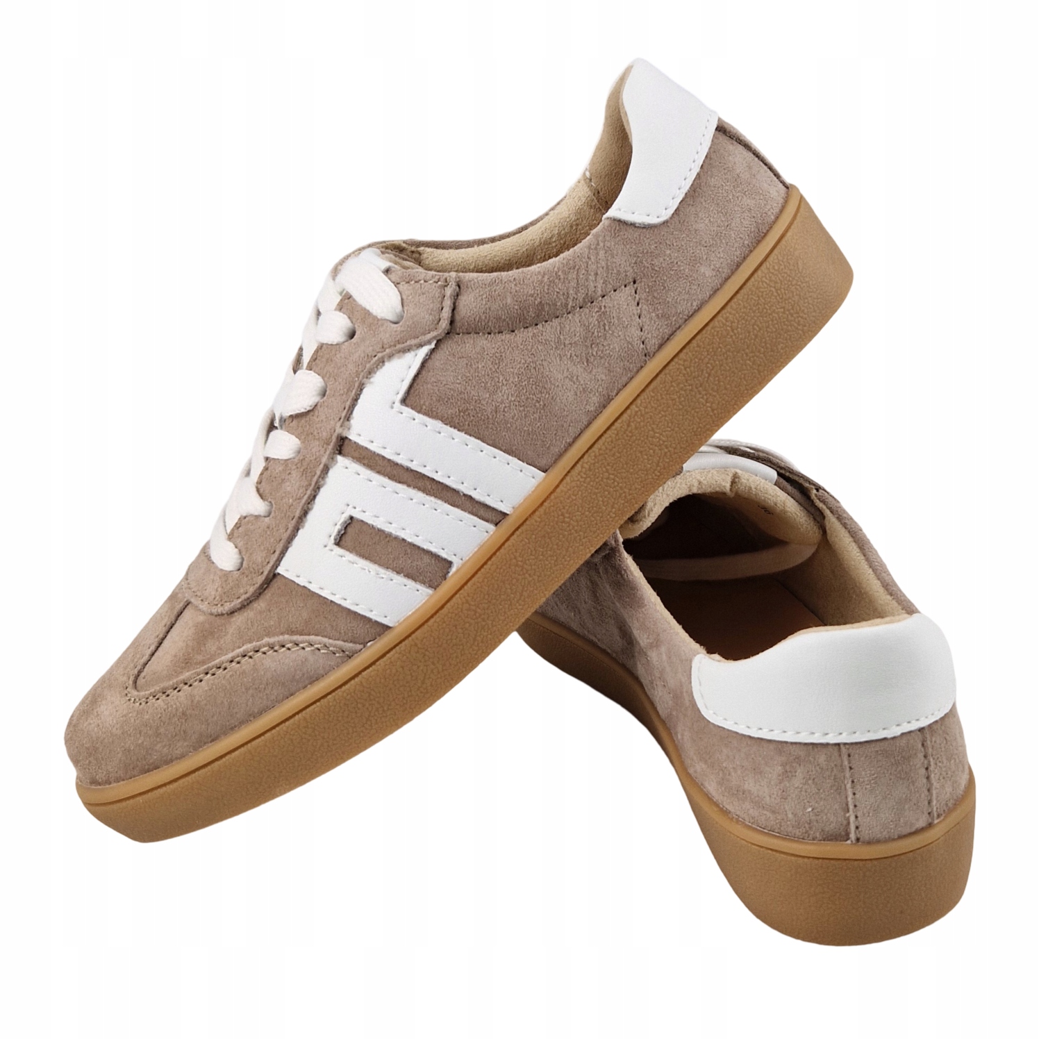 стильні кросівки в класичному, спортивному дизайні, ідеально підходять для повсякденного використання. Верхній виготовлений з натуральної замшевої шкіри. Основна частина бежевого верхнього, що надає свіжий і універсальний вигляд. Контрастні білі смуги з боків додають спортивного персонажа. Класичні шнурування забезпечують гарну підходить до стопи. Взуття має шкіряну вставку, що забезпечує комфорт при ходьбі. Це чудовий вибір для людей, які цінують комфорт та модний, класичний вигляд.
