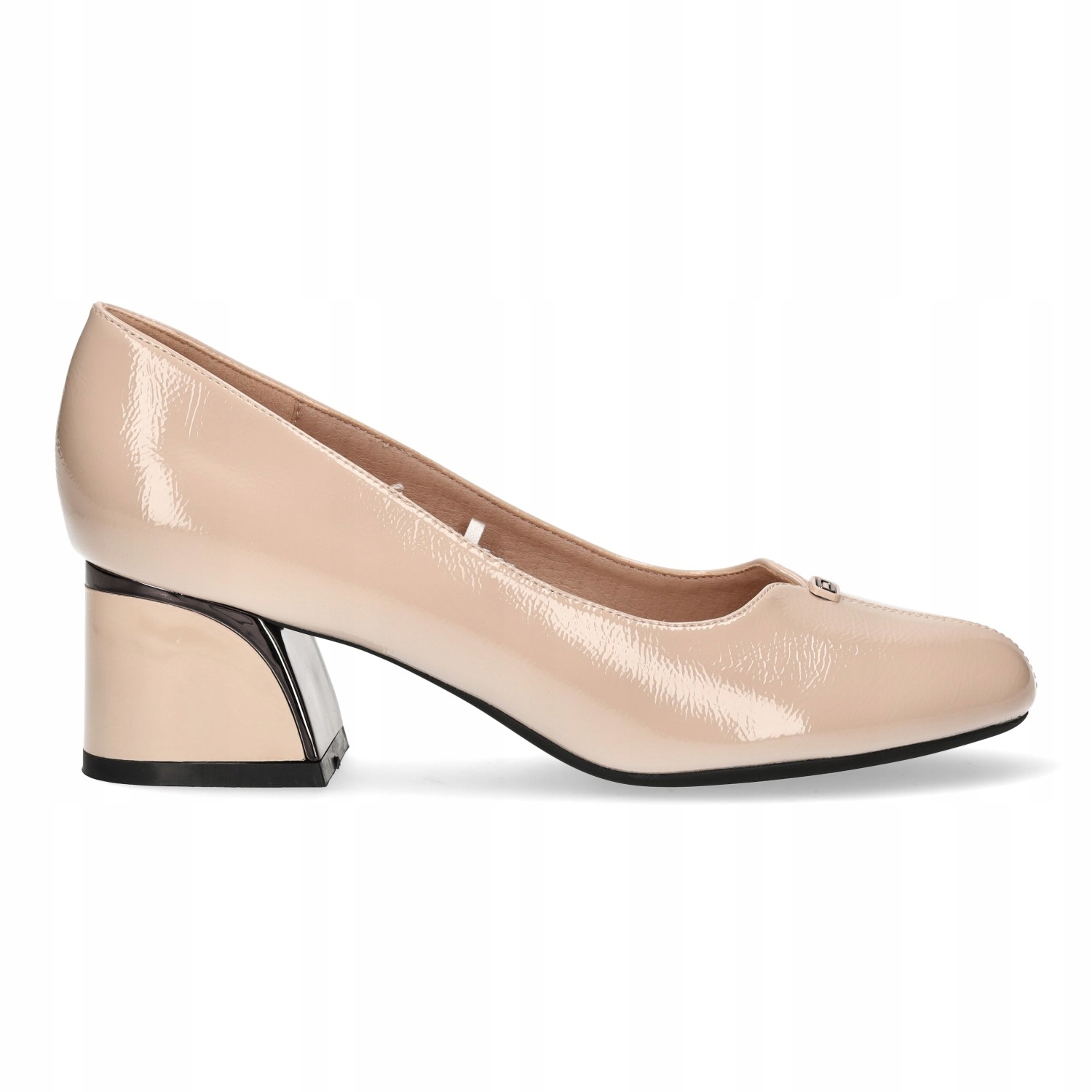 насоси на низькій, стабільній п'яті. Вони мають лаковану бежеву поверхню, яка надає їм елегантний і позачасовий вигляд. П'ята незвична - широка, з блискучою металевою деталізацією, що додає сучасного акценту.