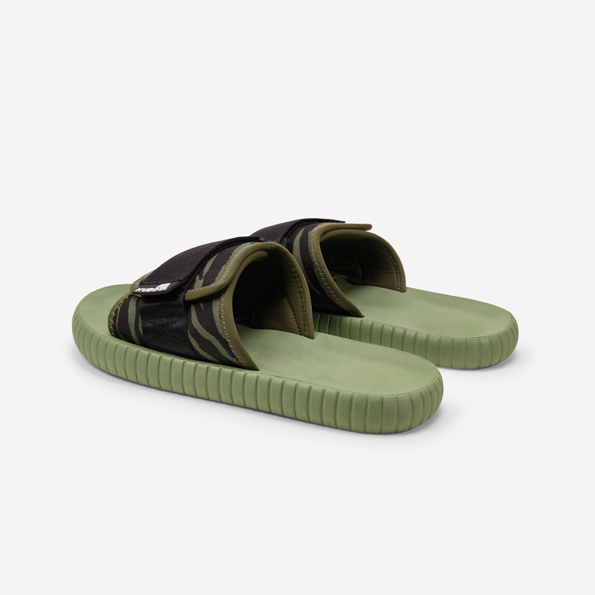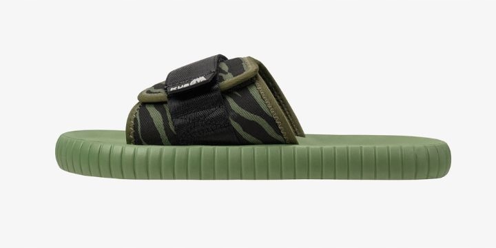 Кольори та візерунок, використаний в зелених шльопанцях Velcro 2.0 Tech Zebra, дозволяють цій моделі ідеально вписатися в пік популярності камуфляжного візерунка, і в той же час ідеально гармоніювати з все ще модними бойовими черевиками. Приглушений, прохолодний оливковий і зебровий візерунок надають чоловічий характер, який додатково підсилює велика верхня стрічка контрастного кольору.