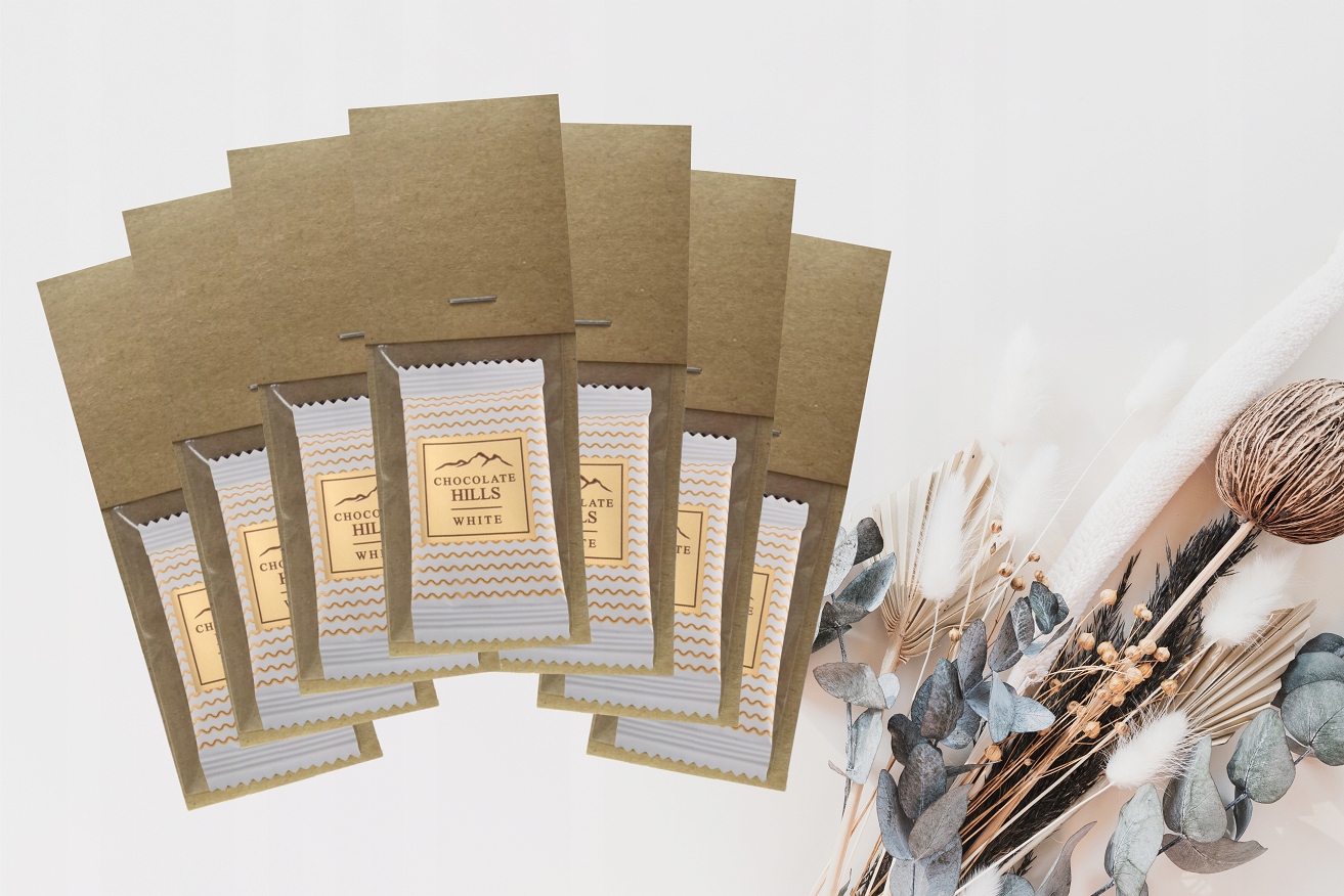 Білі шоколадні цукерки Chocolate Hills упаковані в коричневий (еко) папір. Вага однієї шоколадки: приблизно 5 г. Шоколад без упаковки має розміри 30x40x4 мм, а шоколад у фользі — 36x72x5 мм. Весь подарунок, загорнутий у папір, має приблизно 5,5 см х 15 см.