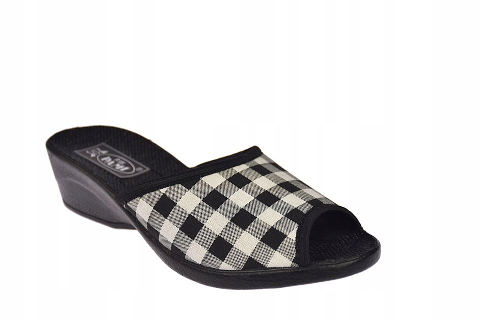 Використання натуральних матеріалів підвищує естетику та клас взуття, у поєднанні з класичним чорно-білим візерунком у клітку, тапочки привертають увагу.
