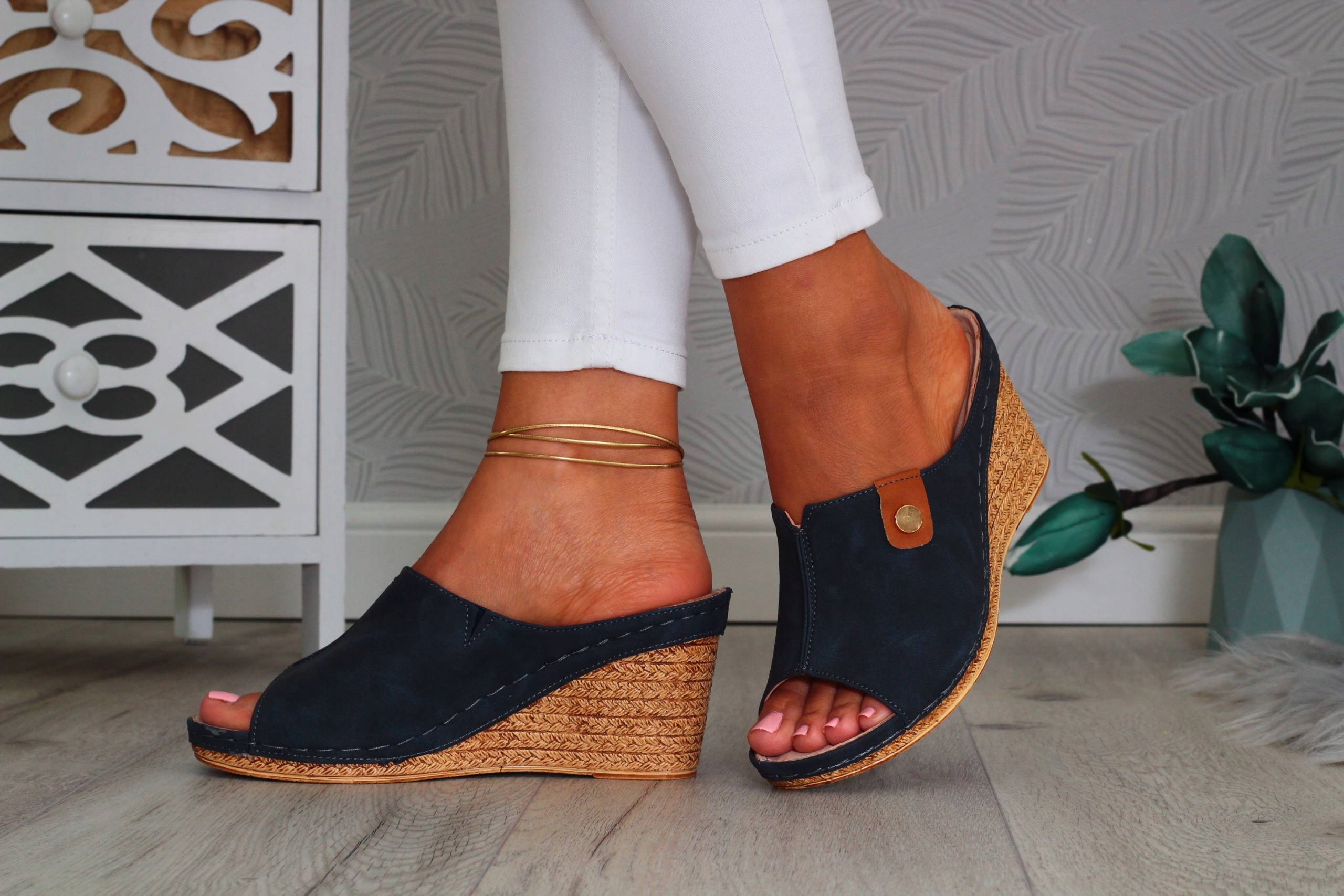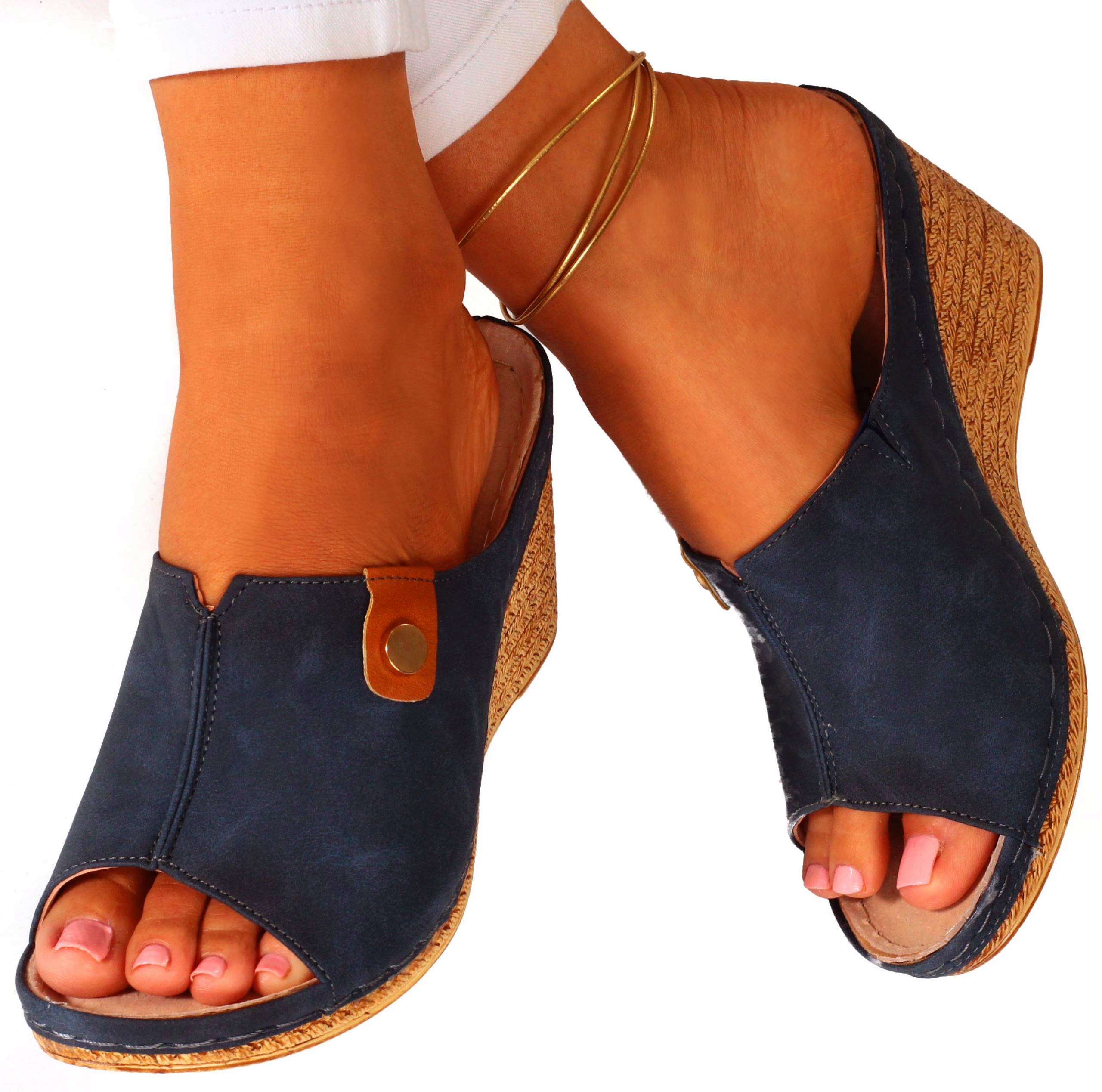 · удар. Жіночі шльопанці на клин. Ідеально як повсякденне взуття. Вони також легко адаптуються до елегантних стилізацій. Профільована шкіряна вставка. Пришита підошва призводить до більш тривалої міцності взуття.