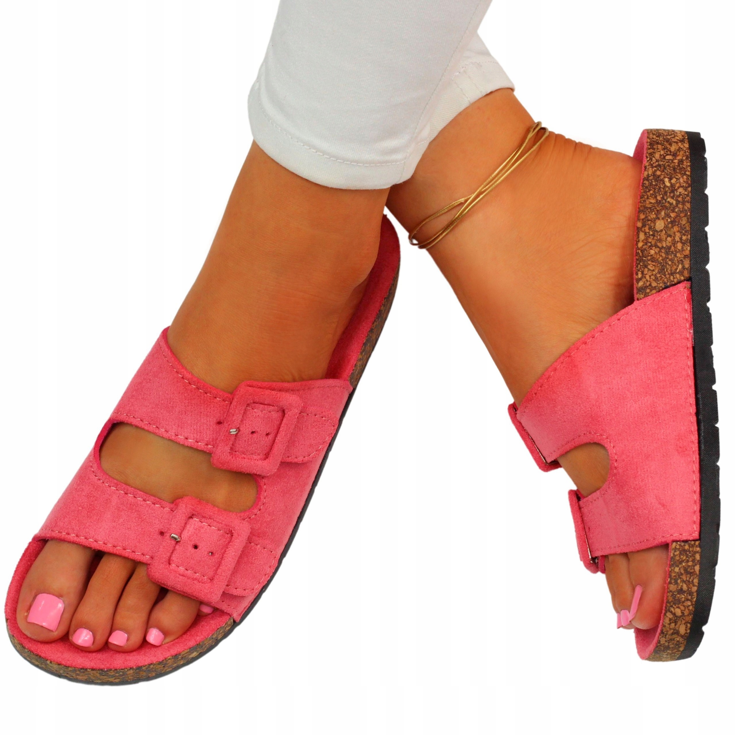 Жіночі шльопанці застібаються на дві пряжки кольору фуксії. Вони ідеально підходять як повсякденне взуття. Вони підійдуть для теплих весняних і спекотних літніх днів. Вони поєднуються з багатьма стилями. Плоска коркова підошва і профільована устілка забезпечують комфорт і зручність використання. Оздоблення замшею.
