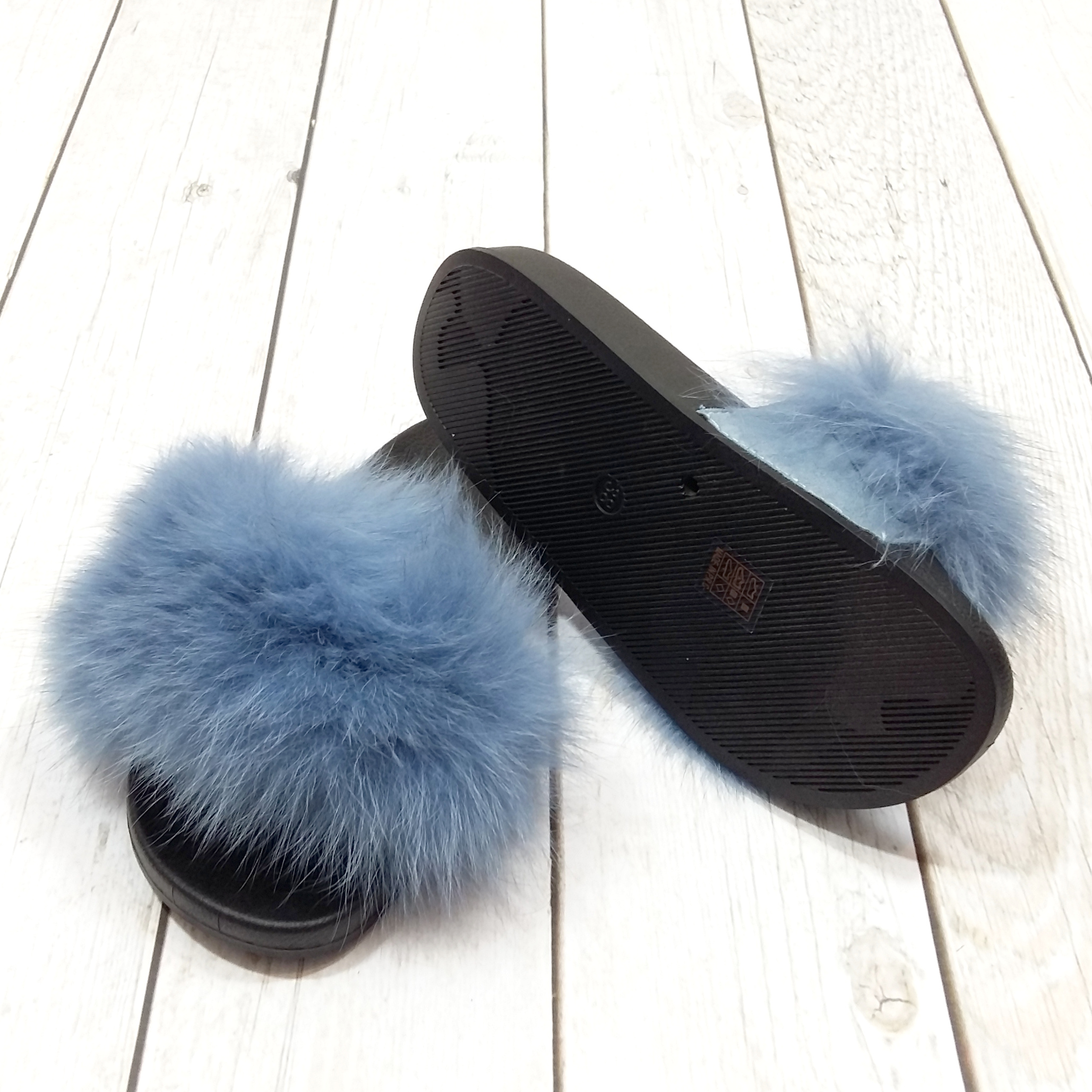 Ретельно оздоблені, на м'якій гнучкій гумовій підошві. Профільована устілка. Хутро пофарбоване в красивий блакитний колір. Хутряний пояс обшитий знизу м'яким матеріалом.