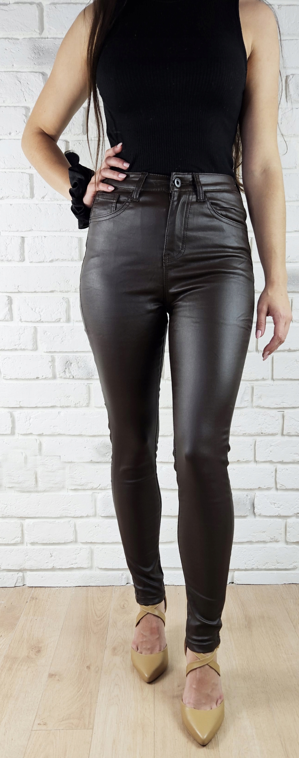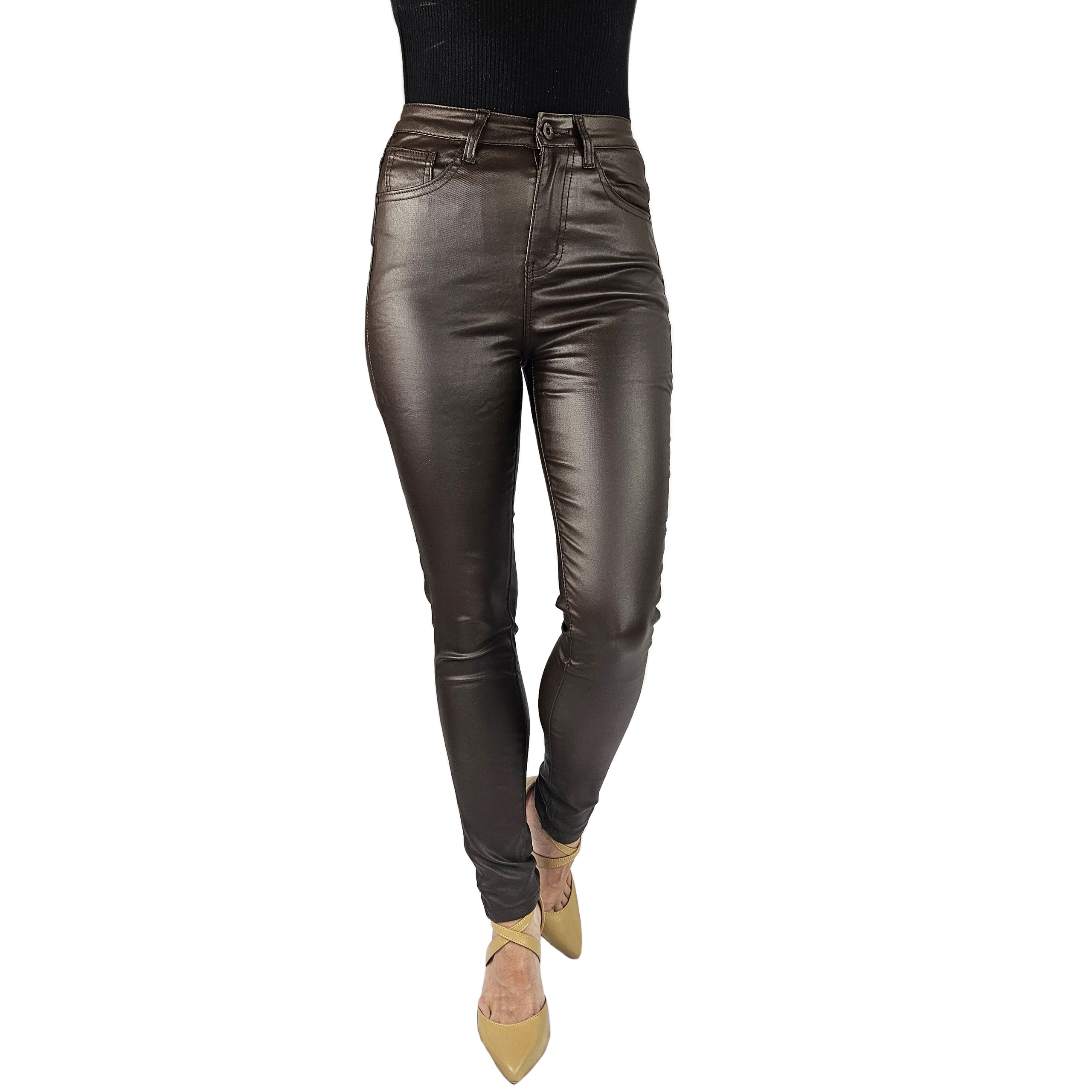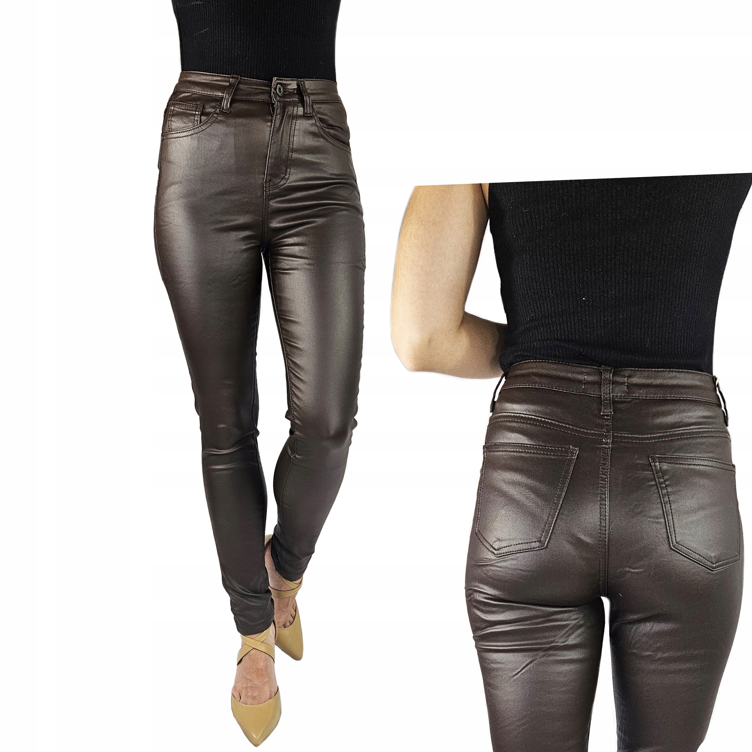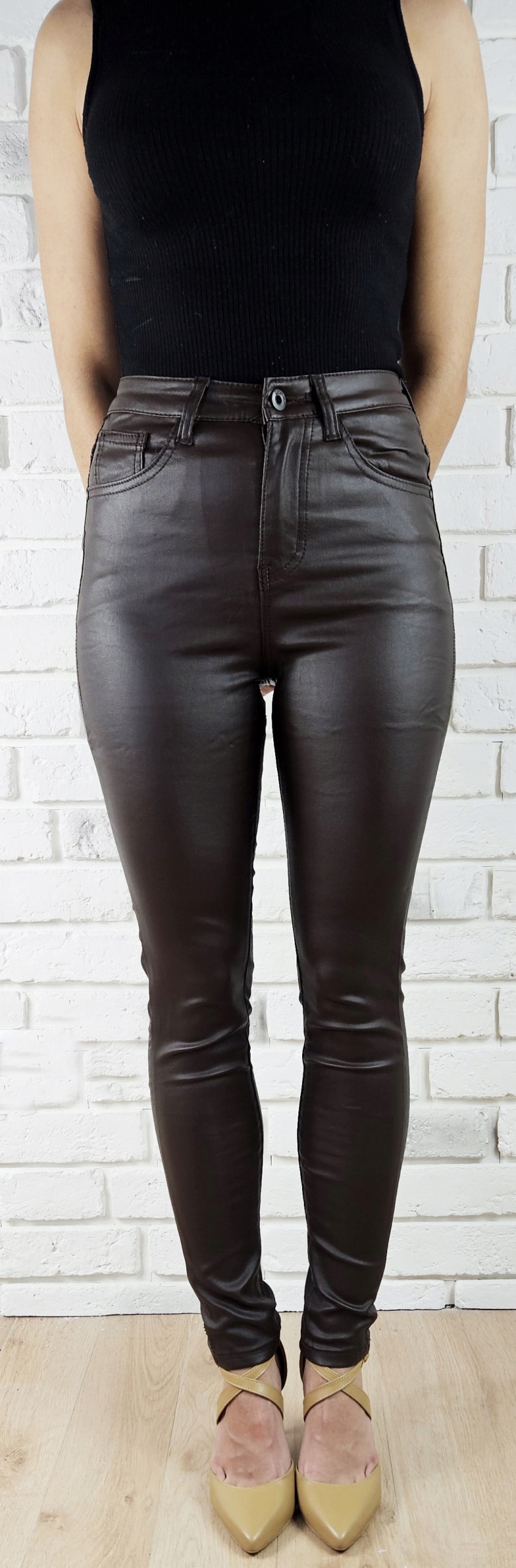 - Чудові штани вощені кольору імітують шкіру, із завищеною талією. Чудові для спортивного взуття. , але також ідеально. Вони добре поєднуються з високими підборами, завдяки своїй універсальності вони підходять практично до будь-якого стилю. Гнучкий матеріал підкреслює жіночу фігуру. Штани приталені та стрейч. Підкресліть свої жіночі форми! Зробіть свій повсякденний образ унікальним. Штани мають кишені з обох боків.
