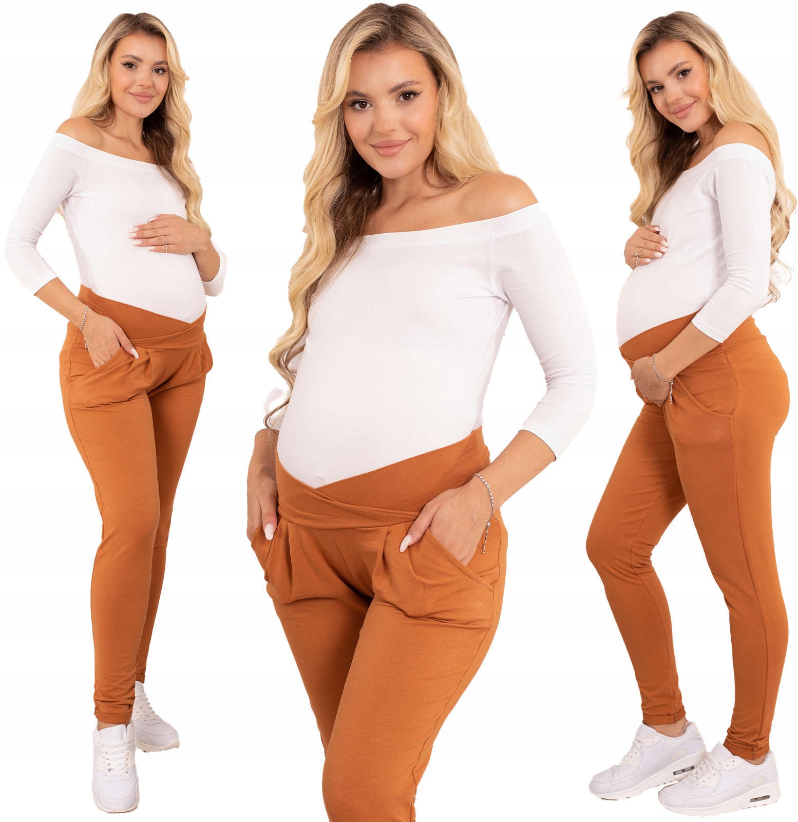 Красиві та зручні жіночі штани-сигарети для вагітних. Розроблений і зшитий, щоб гарантувати максимальну зручність і комфорт під час носіння в винятковий період вагітності та після пологів. Вони адаптуються до фігури, не обтягуючи та не стягуючи. Штани сигарети для вагітних мають складки на рівні талії з передніми кишенями і вшитим на талії нетиснущим поясом, який ідеально облягає живіт, підкреслюючи фігуру. Брюки мають оригінальні підкочені штанини довжиною близько 1 см. Модний, верблюжий колір робить штани надзвичайно оригінальними і стануть ідеальною основою для багатьох повсякденних укладок. Змішуйте кольори та насолоджуйтесь модою також у цей надзвичайний час очікування вашої дитини. Штани ідеально підходять як для повсякденного спортивного одягу, так і для більш елегантних комплектів - поєднуйте їх із класичною білою сорочкою та чорними туфлями на високих підборах, і ви отримаєте позачасовий стиль, який добре працюватиме в багатьох офіційних обставинах. Для повсякденного носіння поєднуйте їх з яскравим світшотом і спортивним взуттям - це ідеальний комплект для шопінгу, прогулянки з друзями або прогулянки. Матеріал, з якого виготовлені жіночі брюки для вагітних дуже м'який і ніжний на дотик, знизу є петелька.