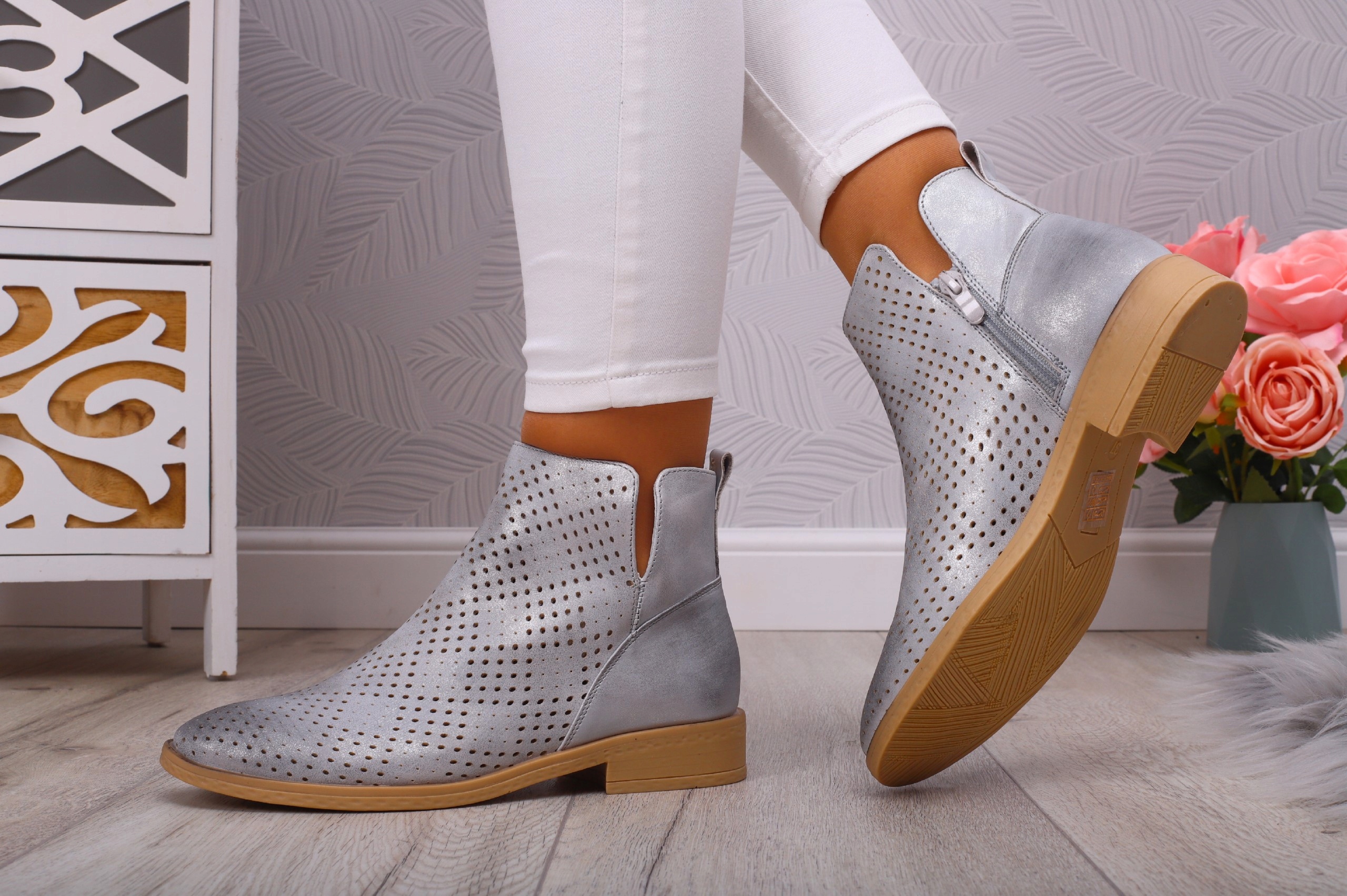 Елегантні жіночі ботильйони з екологічної шкіри сріблястого кольору. Виготовлений з високоякісних матеріалів, ідеально підходить для весни або осені. Ремінна підошва забезпечує стабільність і комфорт використання. М'яка підкладка забезпечує комфорт під час носіння взуття. Модний дизайн доповнить багато стилів.