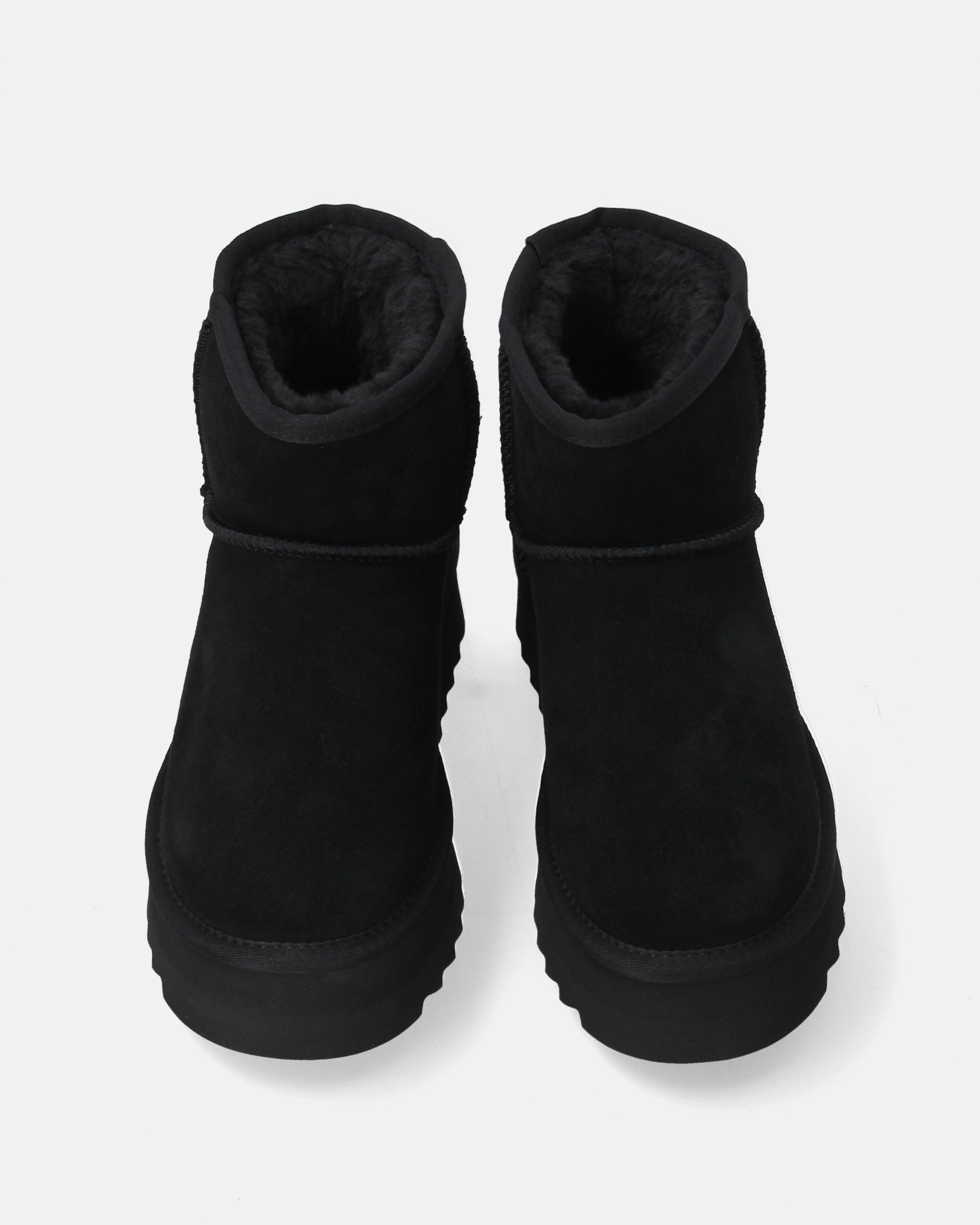 Жіночі снігові черевики з натуральної замші насиченого чорного кольору. Класичний гладкий верх середньої висоти підкреслює простий і позачасовий дизайн. Внутрішня підкладка з м'якого хутра гарантує тепловий комфорт і зручність у холодні дні. Модель встановлена на більш товсту підошву з чітким протектором, що забезпечує стійкість і безпеку на слизькій поверхні. Універсальний крій підійде як у повсякденний, так і в зимовий, повсякденний стиль.