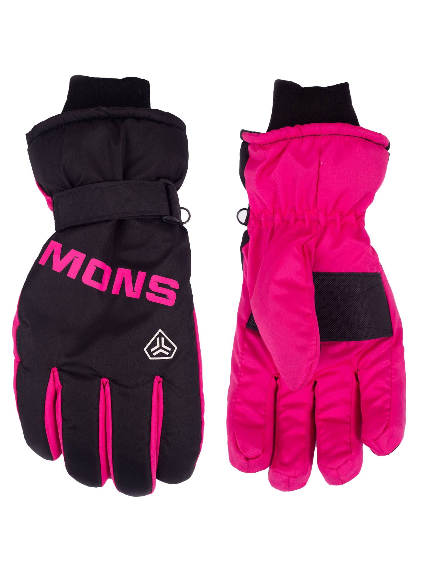 Жіночі лижні рукавички чорного та рожевого кольору з напис: СНІГ. Внутрішня частина рукавички оброблена гарним пухом.