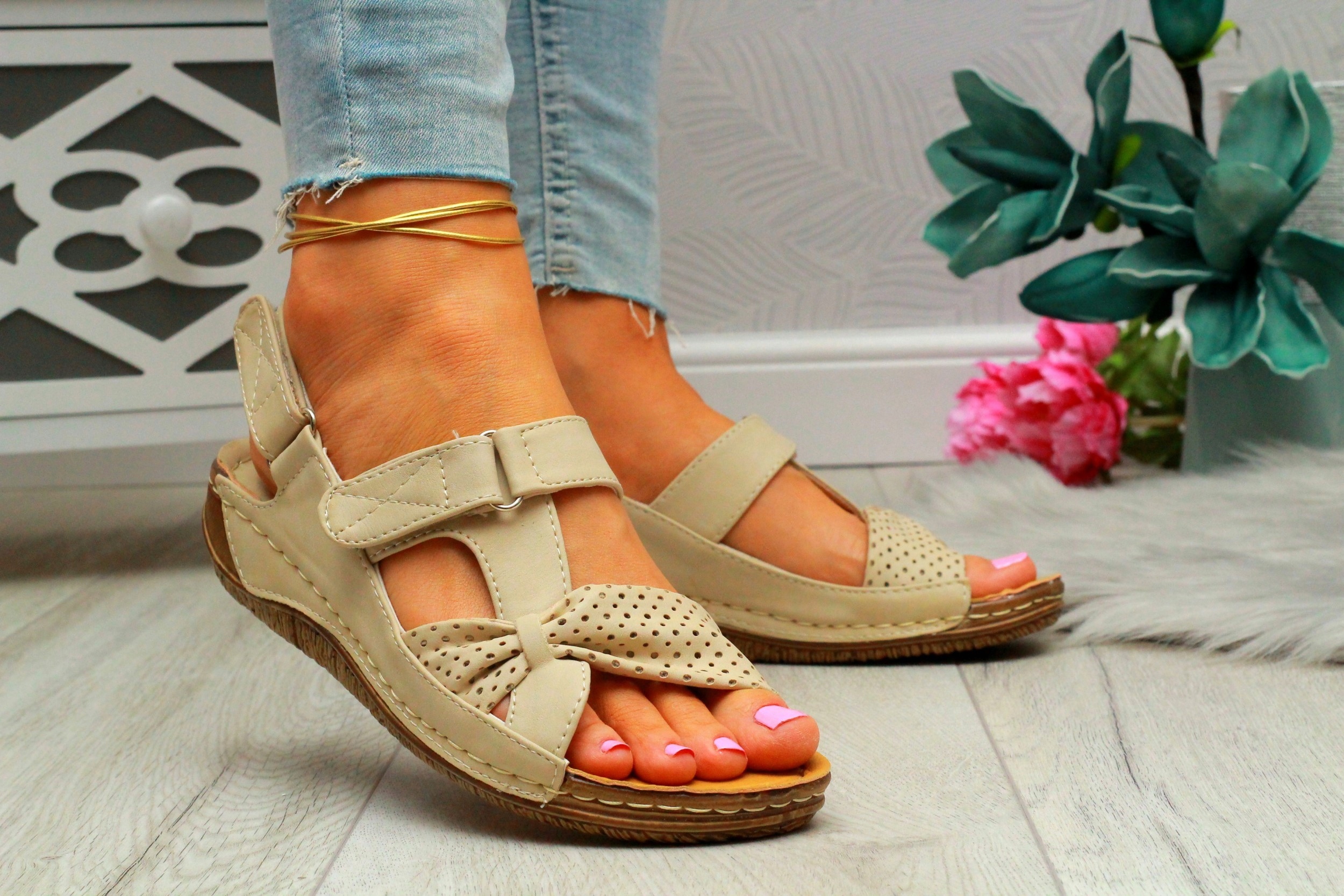 Жіночі бежеві босоніжки на товстій підошві. Зручна профільована устілка робить їх ідеальними для щоденного використання. Простий чорний дизайн підійде до багатьох стилів. Застібка на липучці полегшує надягання. Прошита підошва забезпечує довший термін служби взуття. ❗