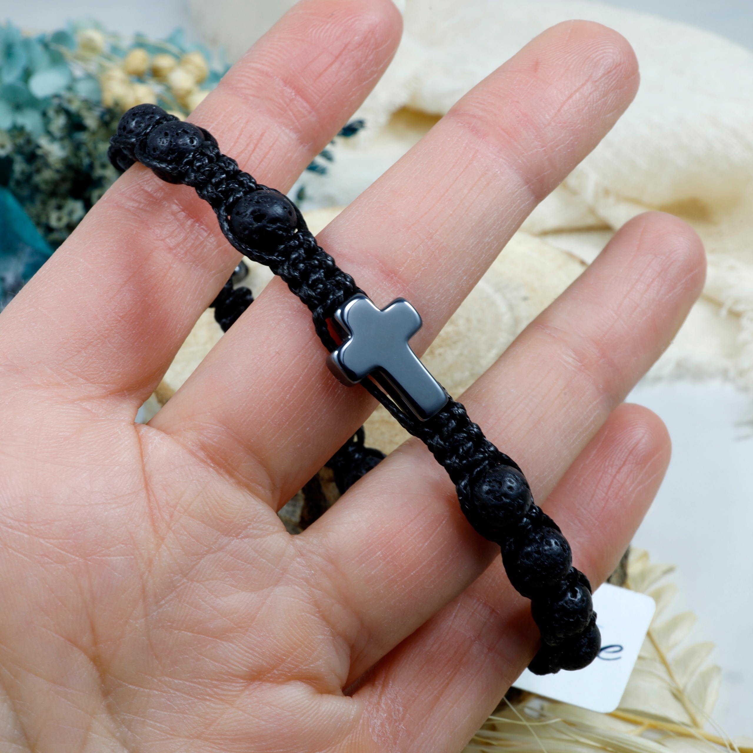 Браслет з натуральних декоративних каменів - вулканічної лави та чорного гематиту методом макраме обплетення нитки з високоякісних волокон з підвищеною стійкістю до стирання та води.