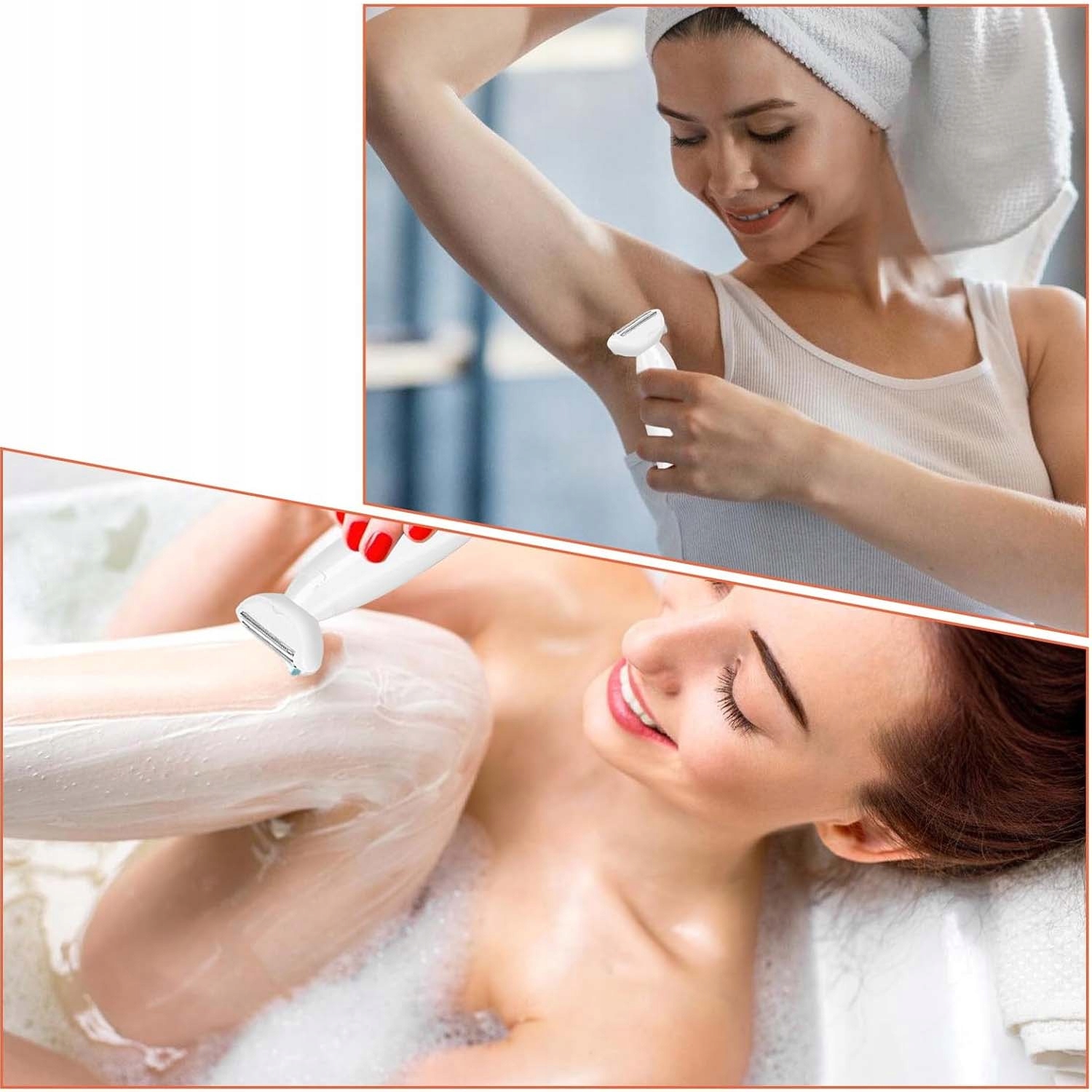 Жіноча бритва має знімну головку, якщо вона покрита волоссям, у комплект входить щіточка для чищення, використовуйте щіточку для очищення головки під водою без залишків волосся. Вологе гоління під душем з гелем або пінкою забезпечує безпечне, чисте гоління за лічені хвилини на частинах тіла тощо. Щоб продовжити термін служби бритви, не занурюйте її повністю у воду.