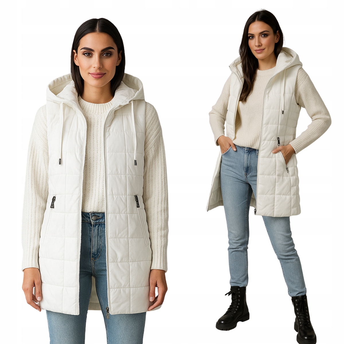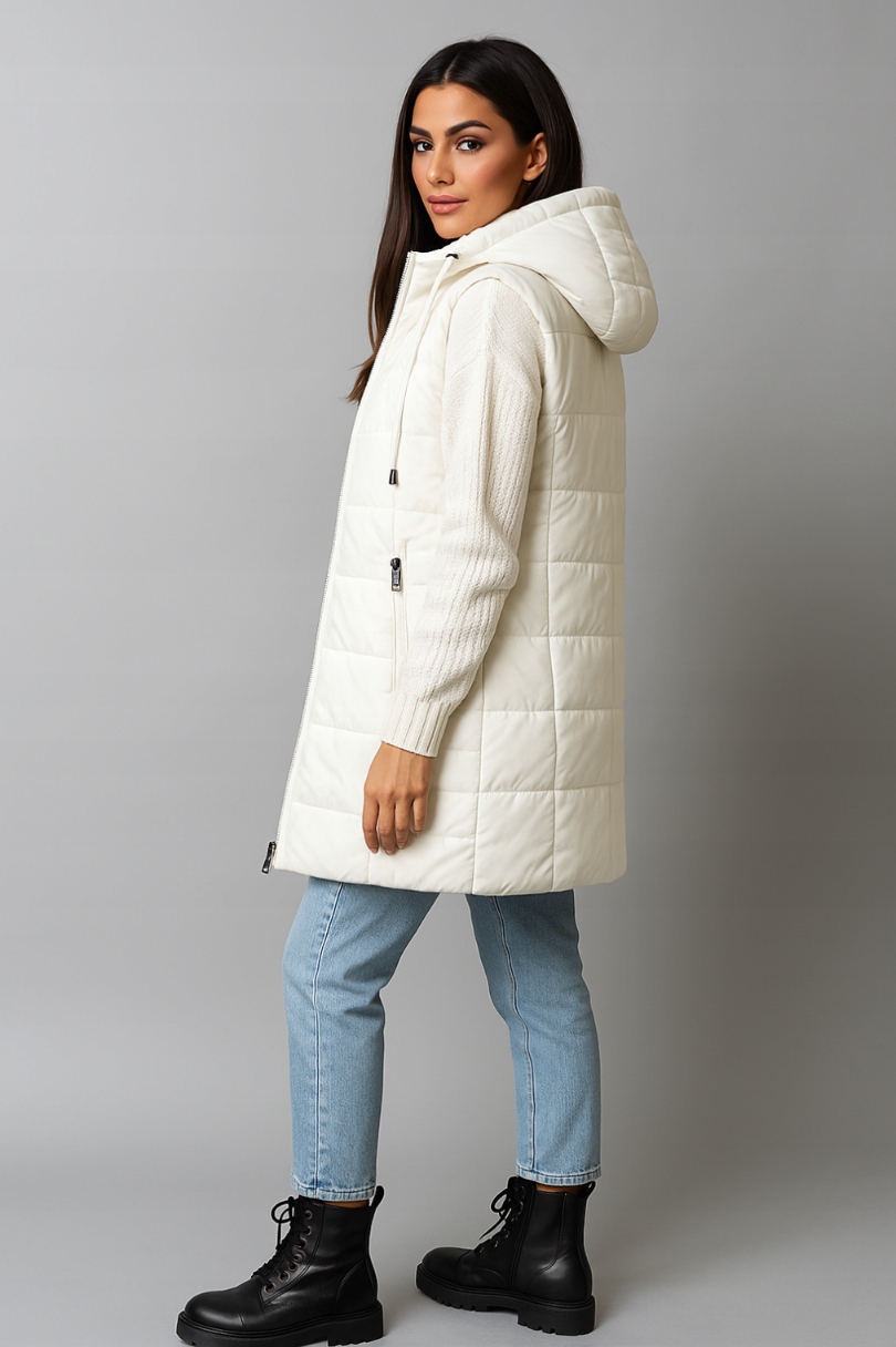 Довга біла жіноча жилетка - це пропозиція для жінок, які хочуть виділитися своїм стилем. Яскравий колір надає будь-якій укладці свіжості та легкості, а подовжений крій робить її надзвичайно практичною. Ідеально підходить для прогулянок, подорожей або повсякденних прогулянок. Капюшон додає спортивний характер і захищає від вітру, а стьобана структура підкреслює модний вигляд.