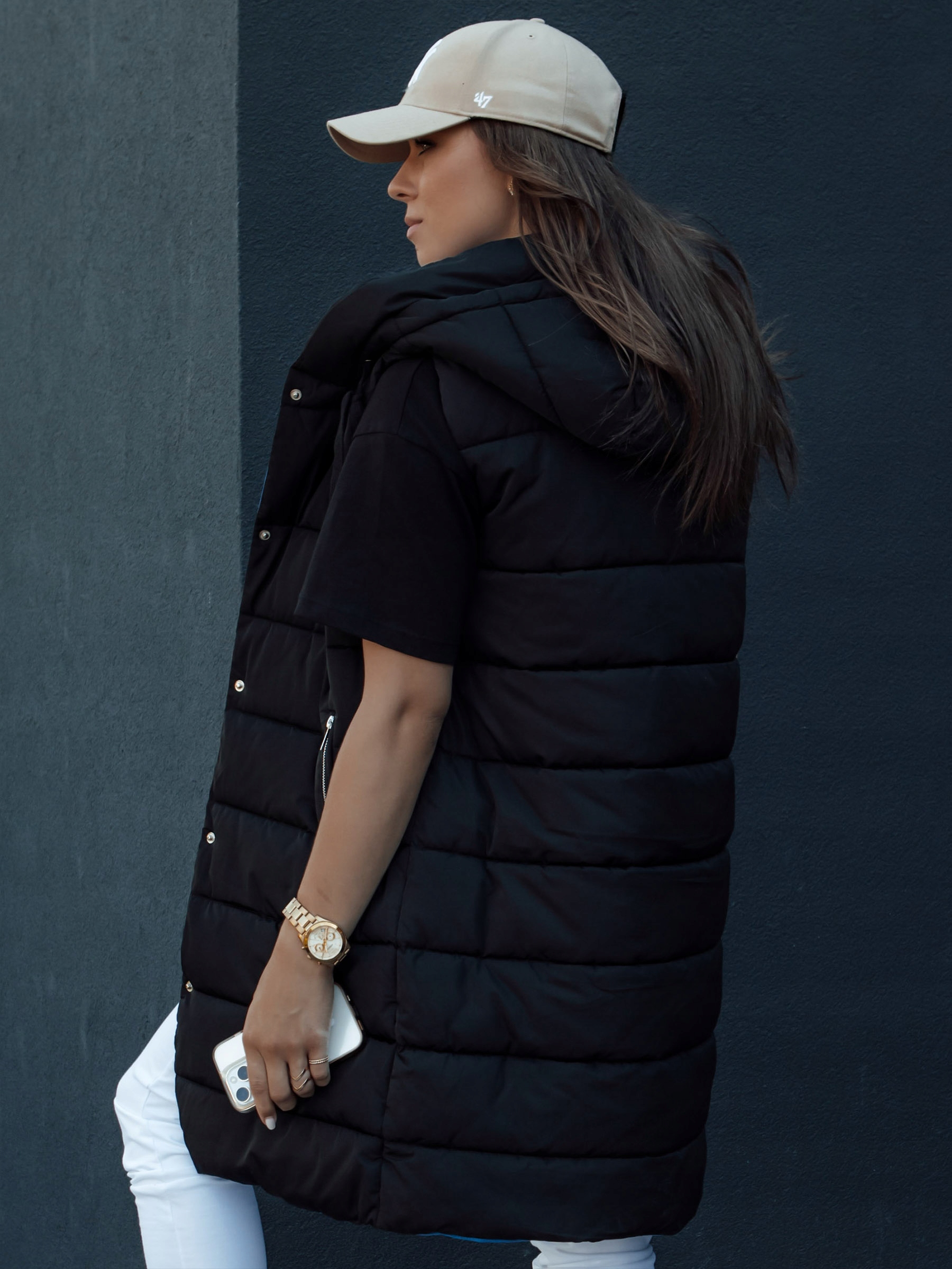 Стильний довгий стьобаний жилет, створений для жінок, які цінують моду та комфорт. Легкий, але дуже теплий, ідеальний для холодних днів. Оснащений практичним капюшоном і глибокими кишенями, він забезпечує не тільки стильний вигляд, але і функціональність. Ідеально підходить для повсякденного носіння, він чудово поєднується з різними стилями, від повсякденного до більш спортивного. Додайте нотку сучасного стилю до свого гардеробу за допомогою цього унікального жилета.