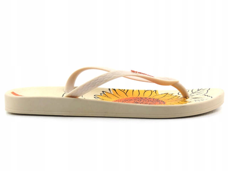 Модель ідеально підходить як для басейну, так і для пляжів, а також для всіх поїздок. 4 Такий матеріал водонепроникний - він не приймає воду і швидко висихає, тому він чудово працює для всіх поїздок і поїздок на пляж чи басейн. Підошва легка та гнучка , вона легко згинається і адаптується. японський виріз тримає ногу краще, ніж класичні шльопанці. На текстурованих смугах був розміщений логотип бренду бренда . На підошві є принт з великою квіткою в теплих сонячних кольорах.