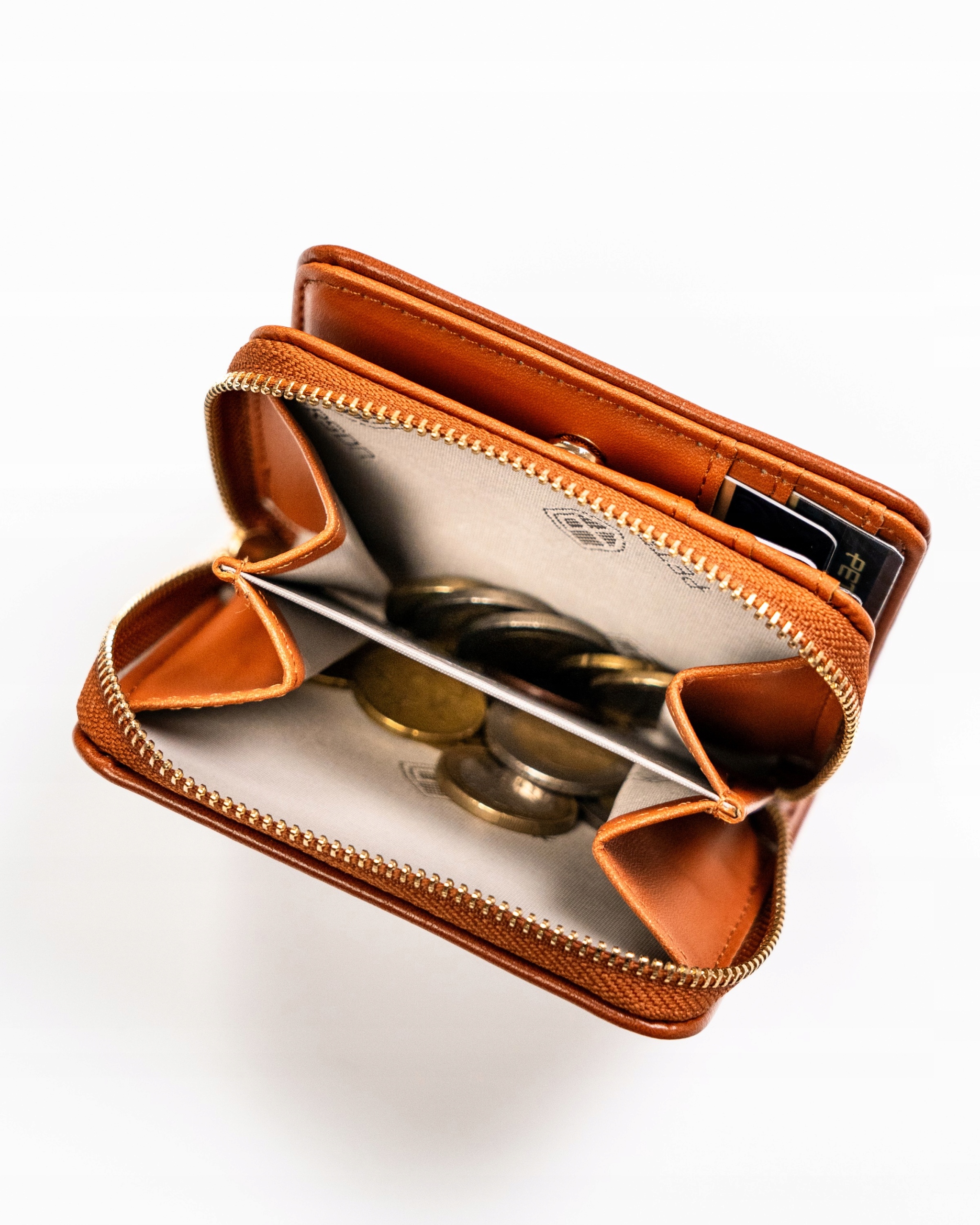Гаманець з екологічної шкіри. Відносно невелика модель - ідеальна для невеликих сумок. Він не займе багато місця, його також можна тримати в кишені.