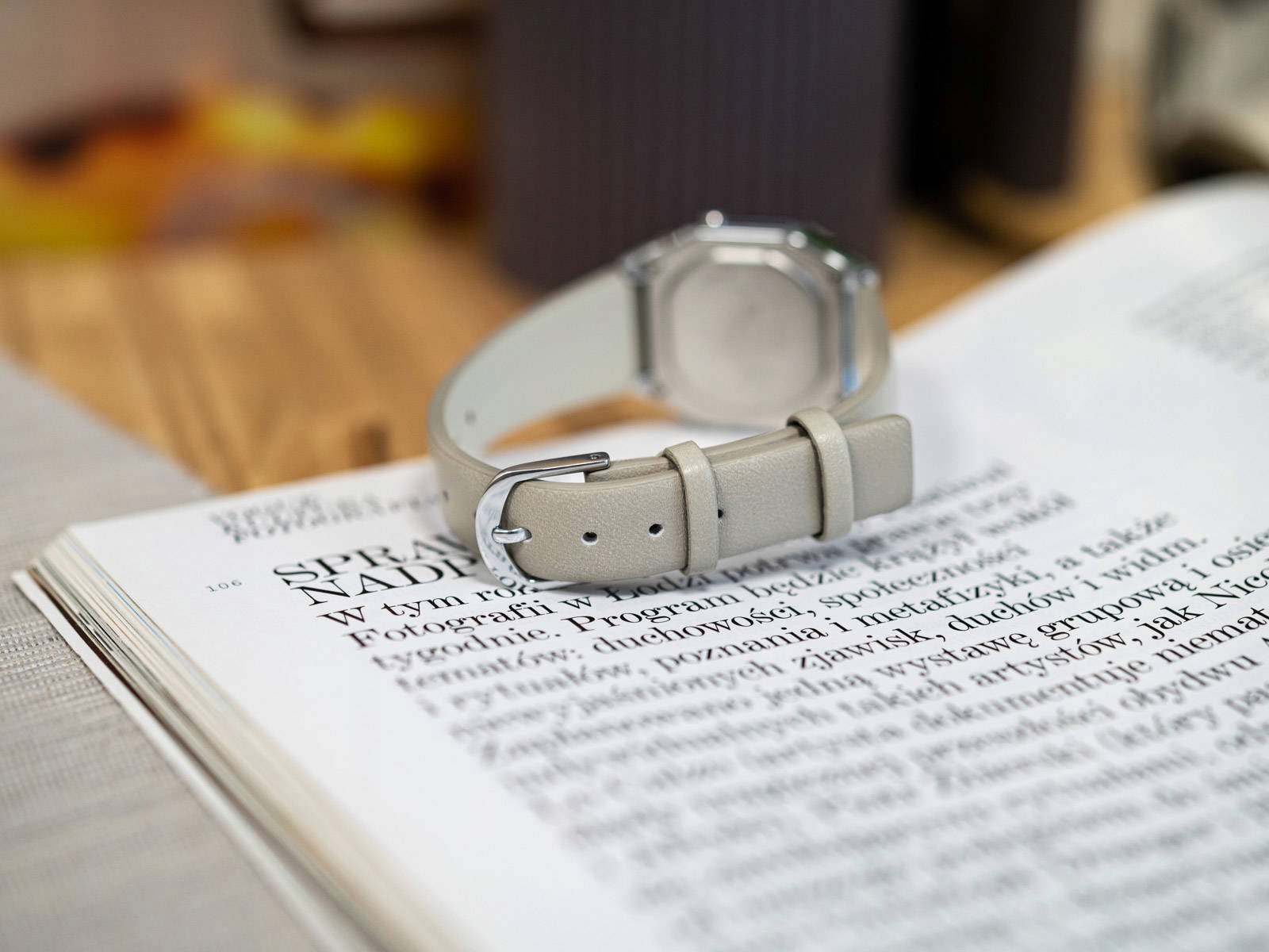 Годинник чудово виглядає на жіночому зап'ясті завдяки чудовому поєднанню сірого та класичного срібла.