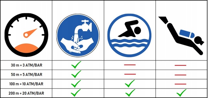 - 20 ATM / бар / 200 м: Водонепроникний годинник, стійкий підводне плавання. Годинник підходить для всіх водних видів спорту.