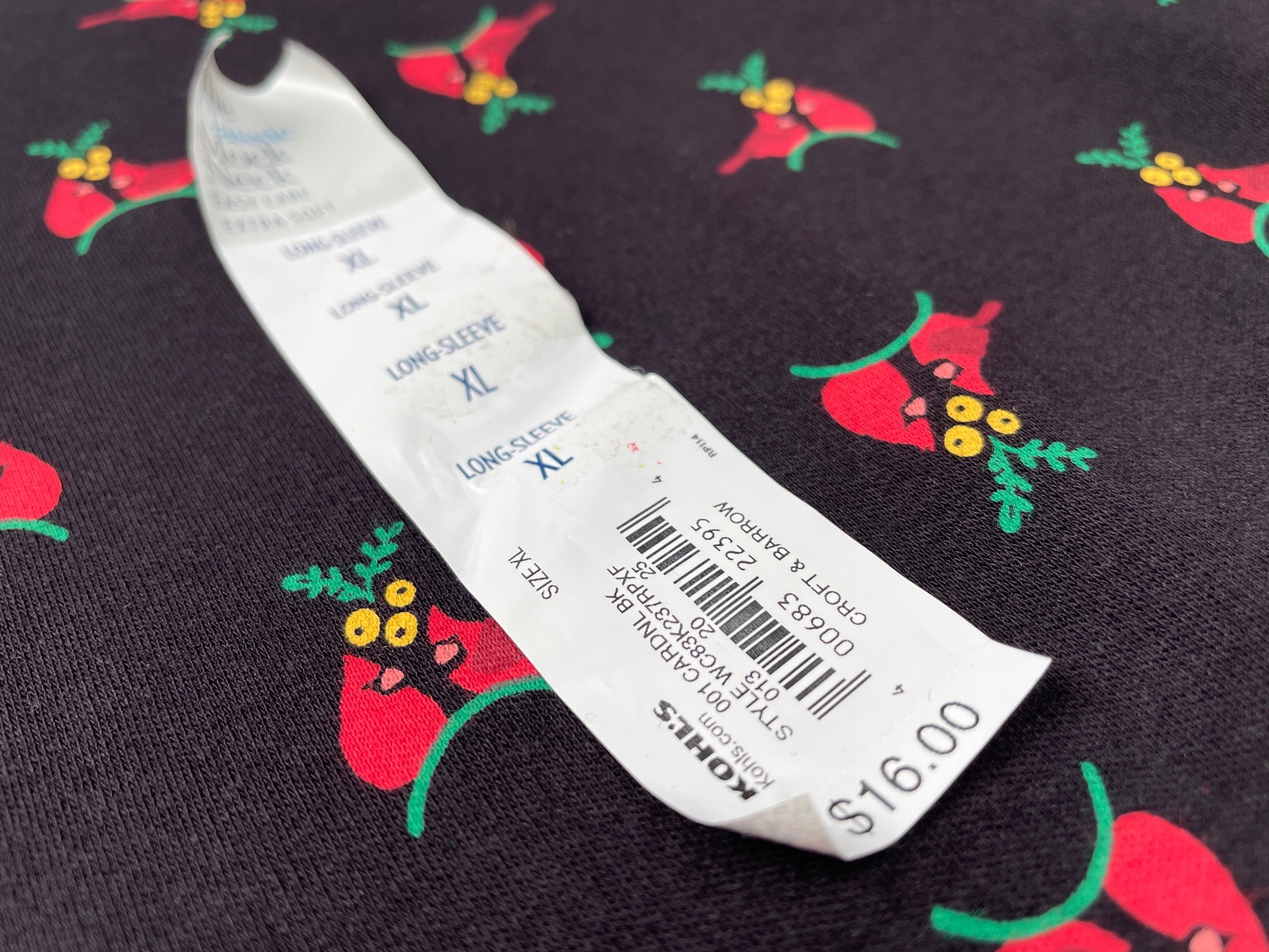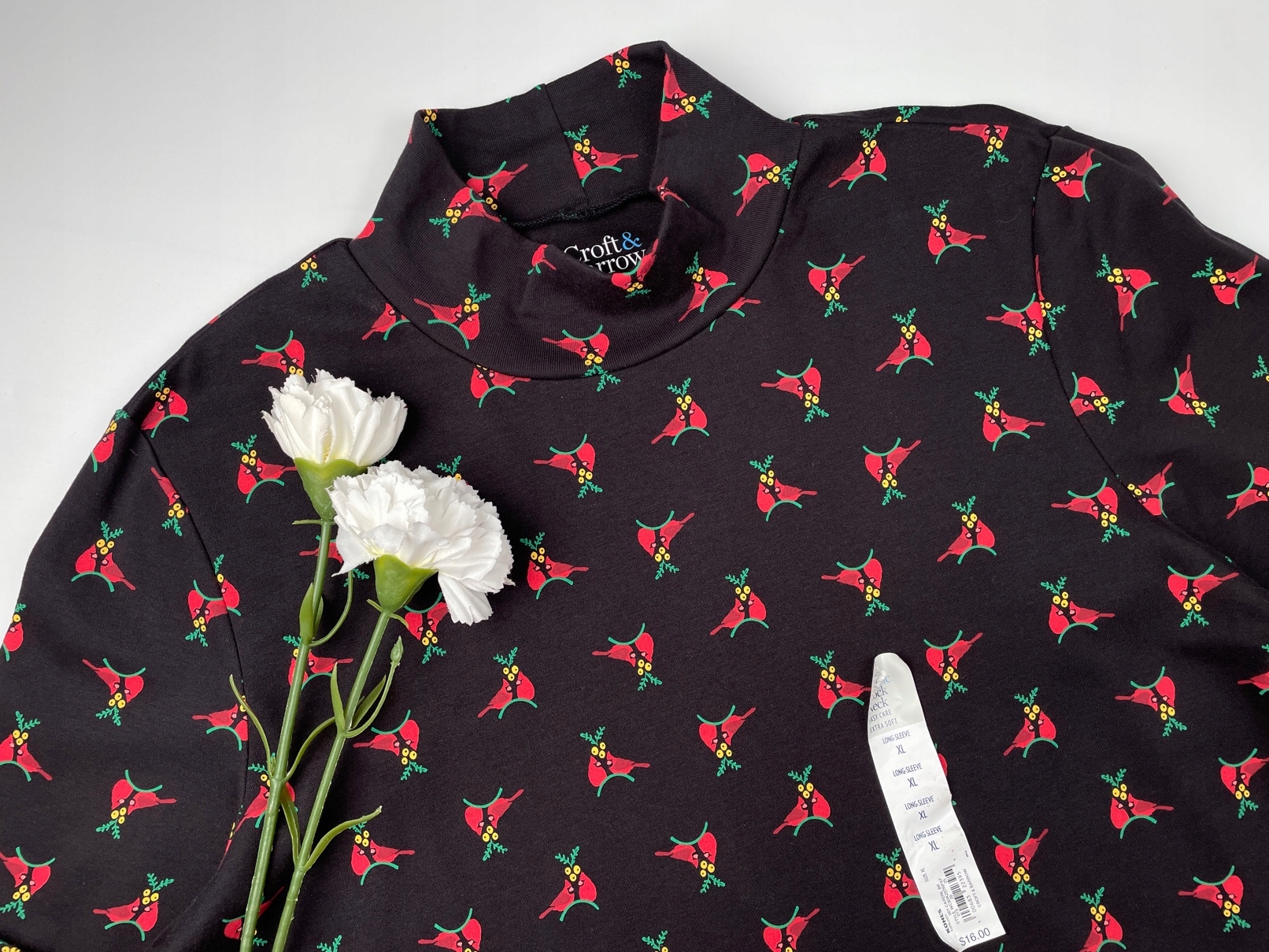 - Жіночий гольфік від Croft & Barrow. Він у класичному чорному кольорі, зі святковим малюнком червоних птахів під омелою. Він був зроблений з приємного на дотик, злегка гнучкий матеріал. Він має класичний розріз, довгі рукави та напівгірні.