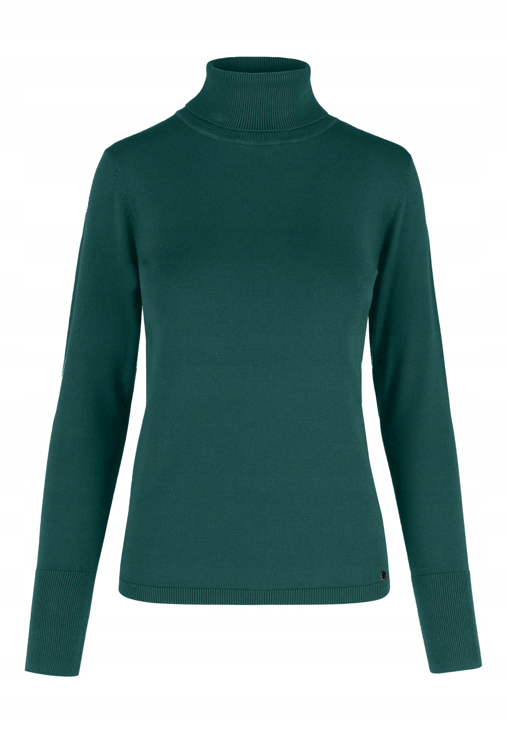 Зелена водолазка має приталений крій і підкреслює фігуру. Рукава оброблені широкими манжетами в рубчик. Весь дизайн простий, елегантний і доповнений ювелірними деталями Volcano.