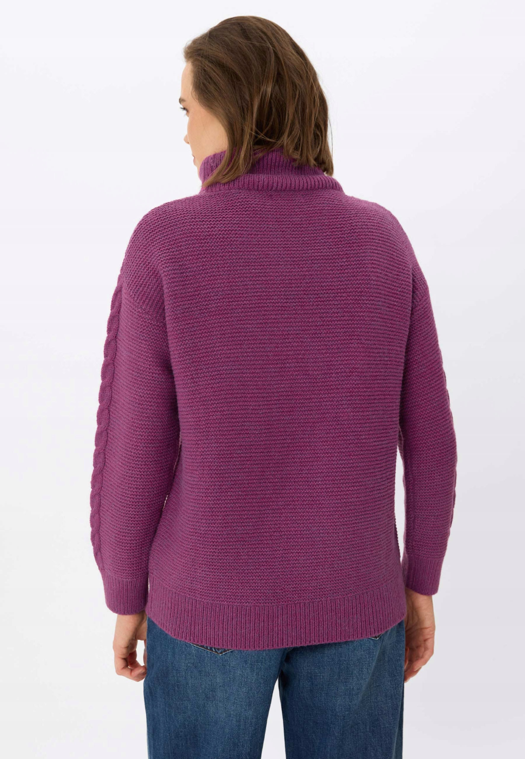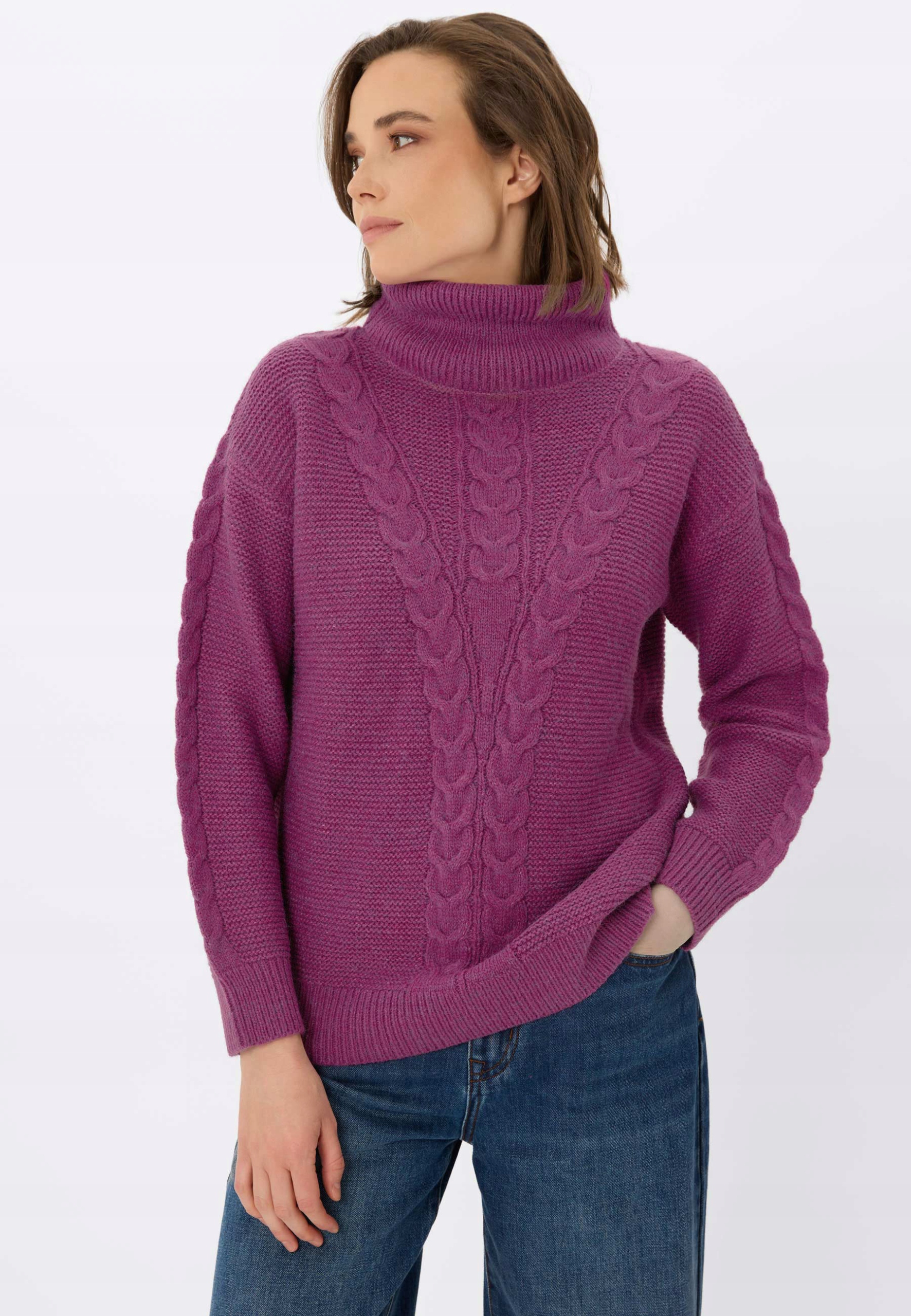 Важливим елементом цього светра є ефектний тросовий візерунок, який проходить вертикально посередині спереду, а також прикрашає рукава, надаючи йому класичний вигляд. Висока водолазка ідеально захищає шию від холоду, додаючи всьому образу затишку та елегантності. Рукава оброблені широкими еластичними манжетами, які забезпечують ідеальну посадку та зберігають тепло. Цей светр є обов'язковим у гардеробі кожної жінки, яка цінує поєднання функціональності, комфорту та позачасового дизайну.