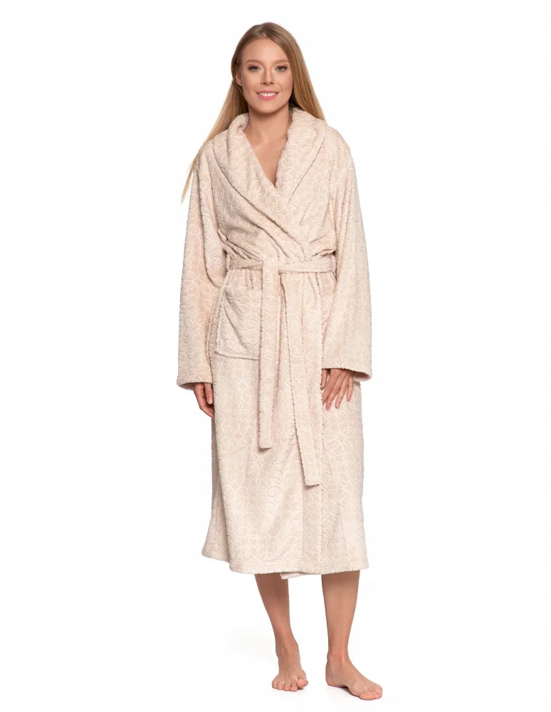 Матеріал, з якого він виготовлений, м'який, приємний до шкіри і легко переться. Бежевий колір і ніжне тиснення додають нічному стилю шик, елегантність і неповторність. Халат оснащений двома глибокими кишенями для дрібниць і поясом на зав'язці, що підкреслює талію.