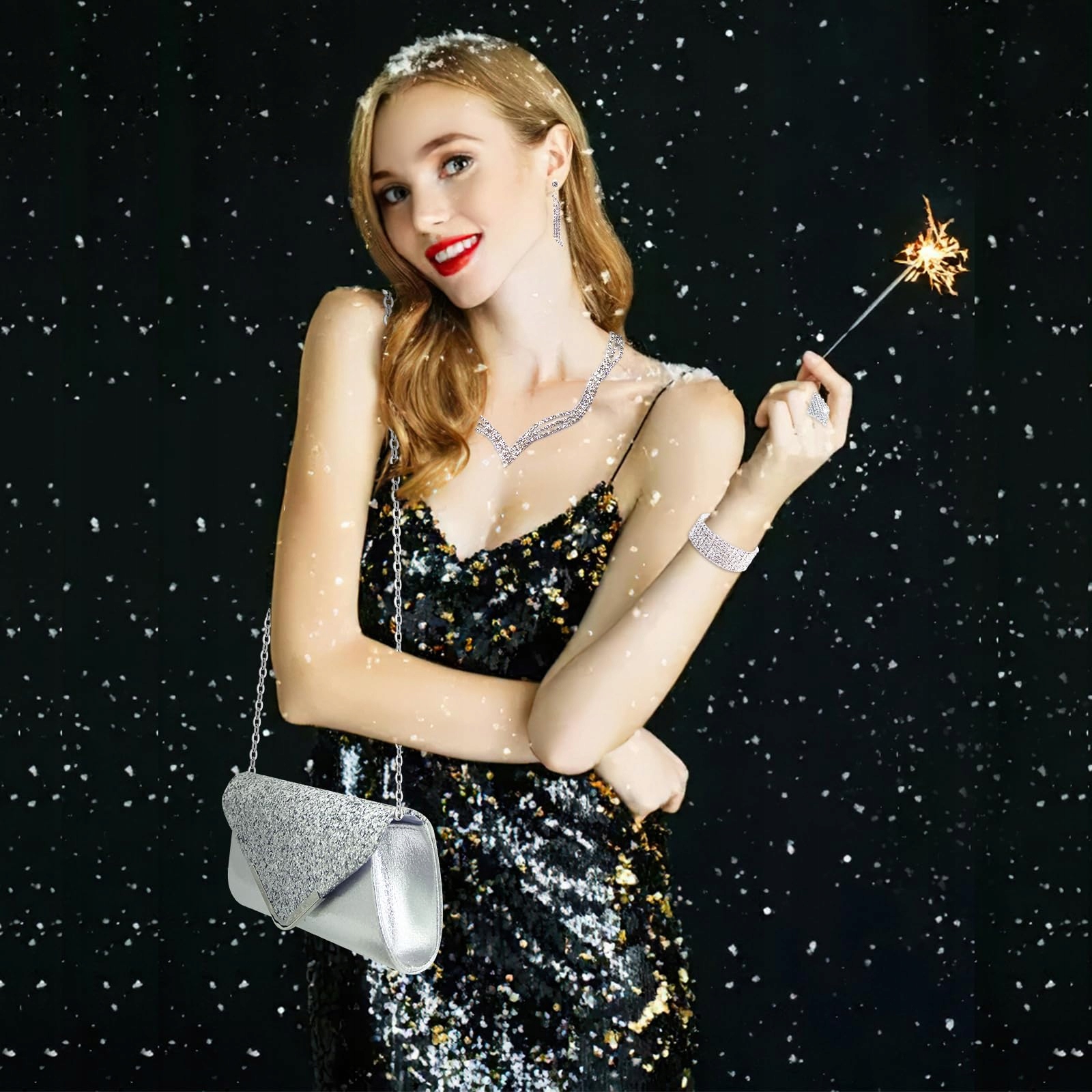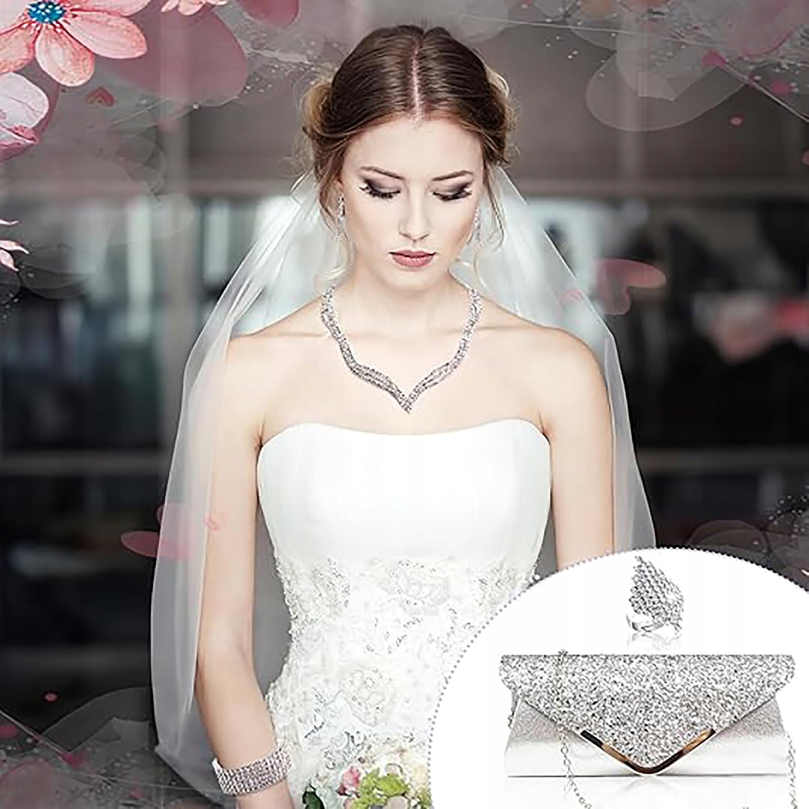 Ідеальний набір аксесуарів: цей набір включає в себе інкрустований діамантами клатч, блискуче намисто, кришталевий браслет, пару сережок і блискучу каблучку – усе, що потрібно для офіційних випадків, таких як весілля, вечірки та вечері.