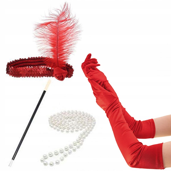 Комплект: довгі вечірні атласні РУКАВИЧКИ + ПОВ'ЯЗКА З ПІР'Я НА ГОЛОВІ + ПЕРЛИНЕ НАМИСТО + СИГАРИТИ - 1920-ті - 1930-ті - 1940-ті