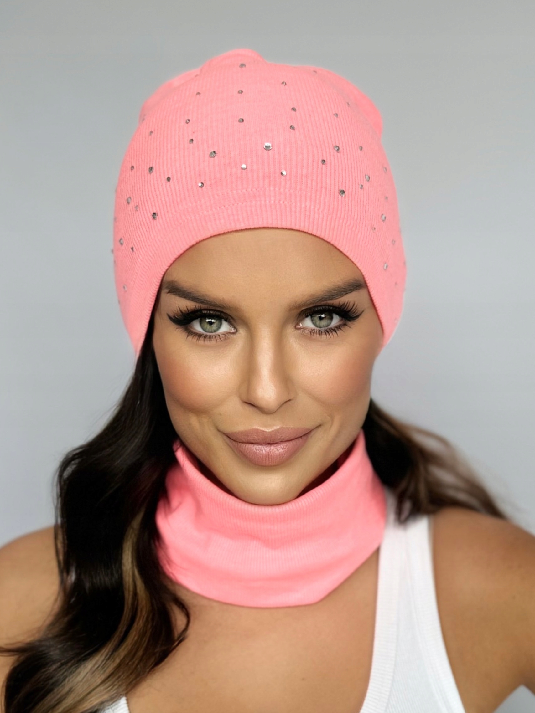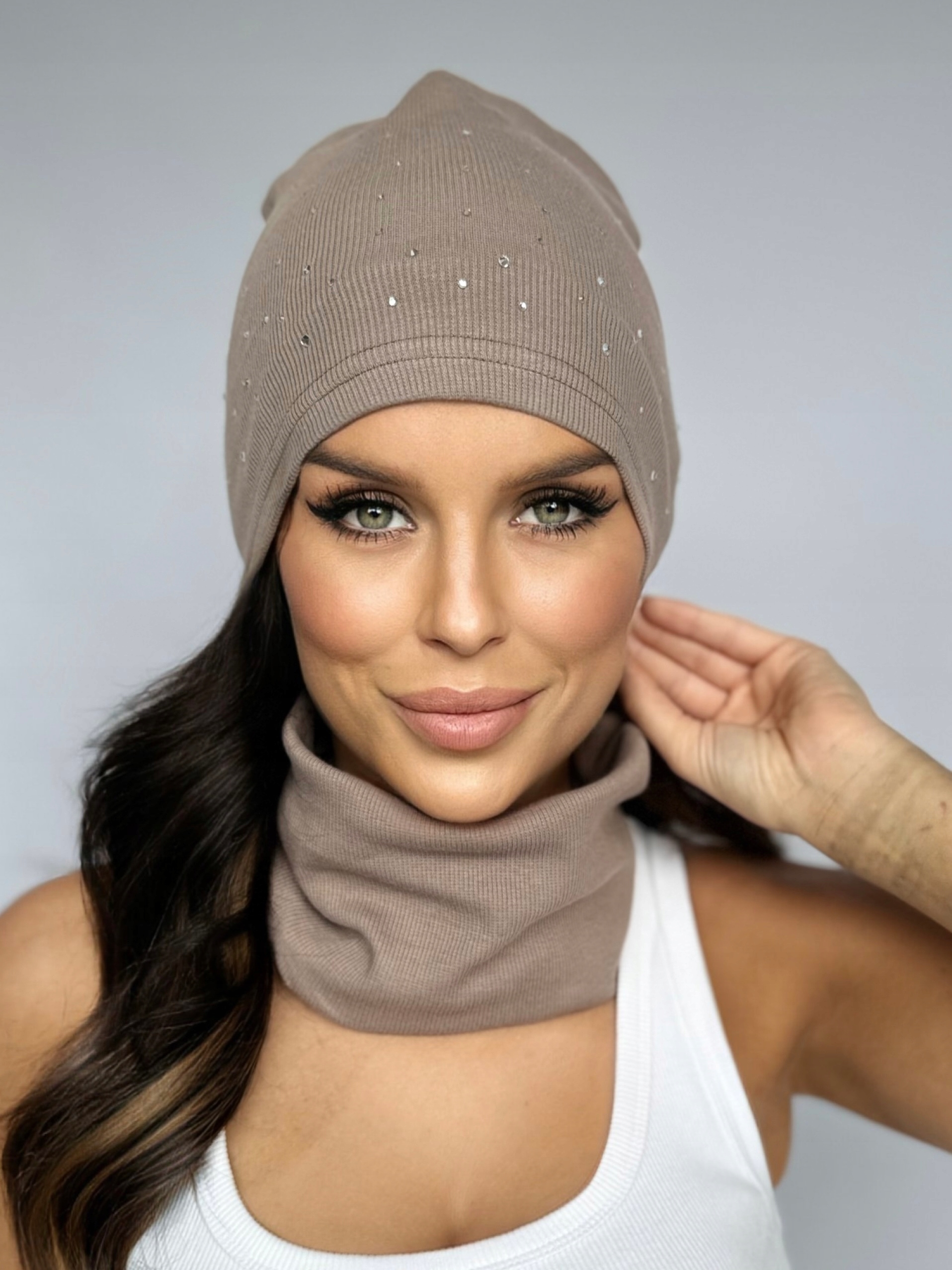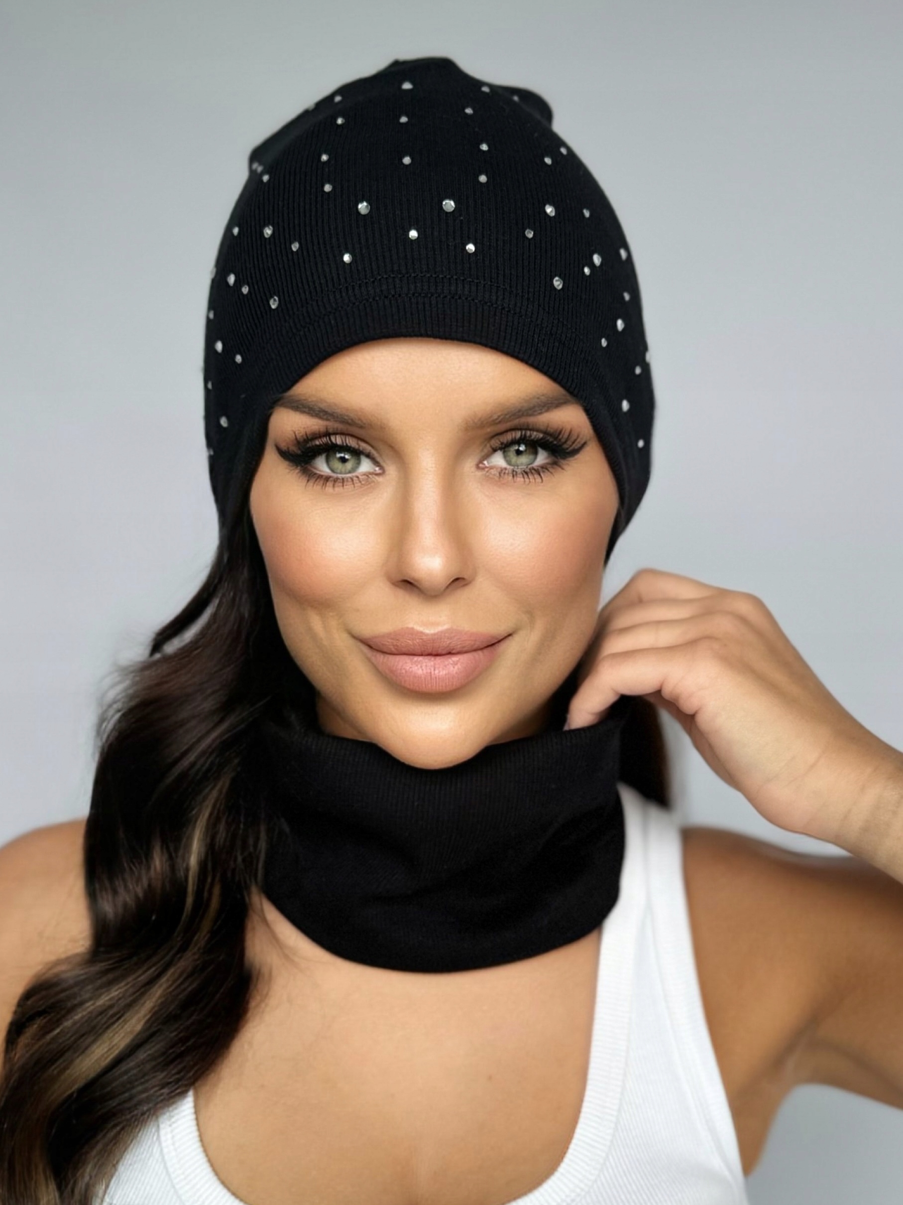 ✅ Шапка типу біні/гном, м'яко спадаюча, згорнута, прикрашена стразами.