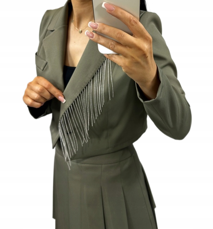 - Блейзер з коміром, декорованим вшитою стрічкою з металевою бахромою