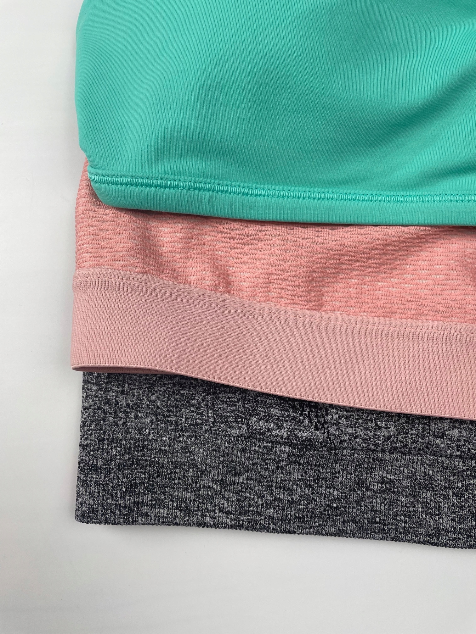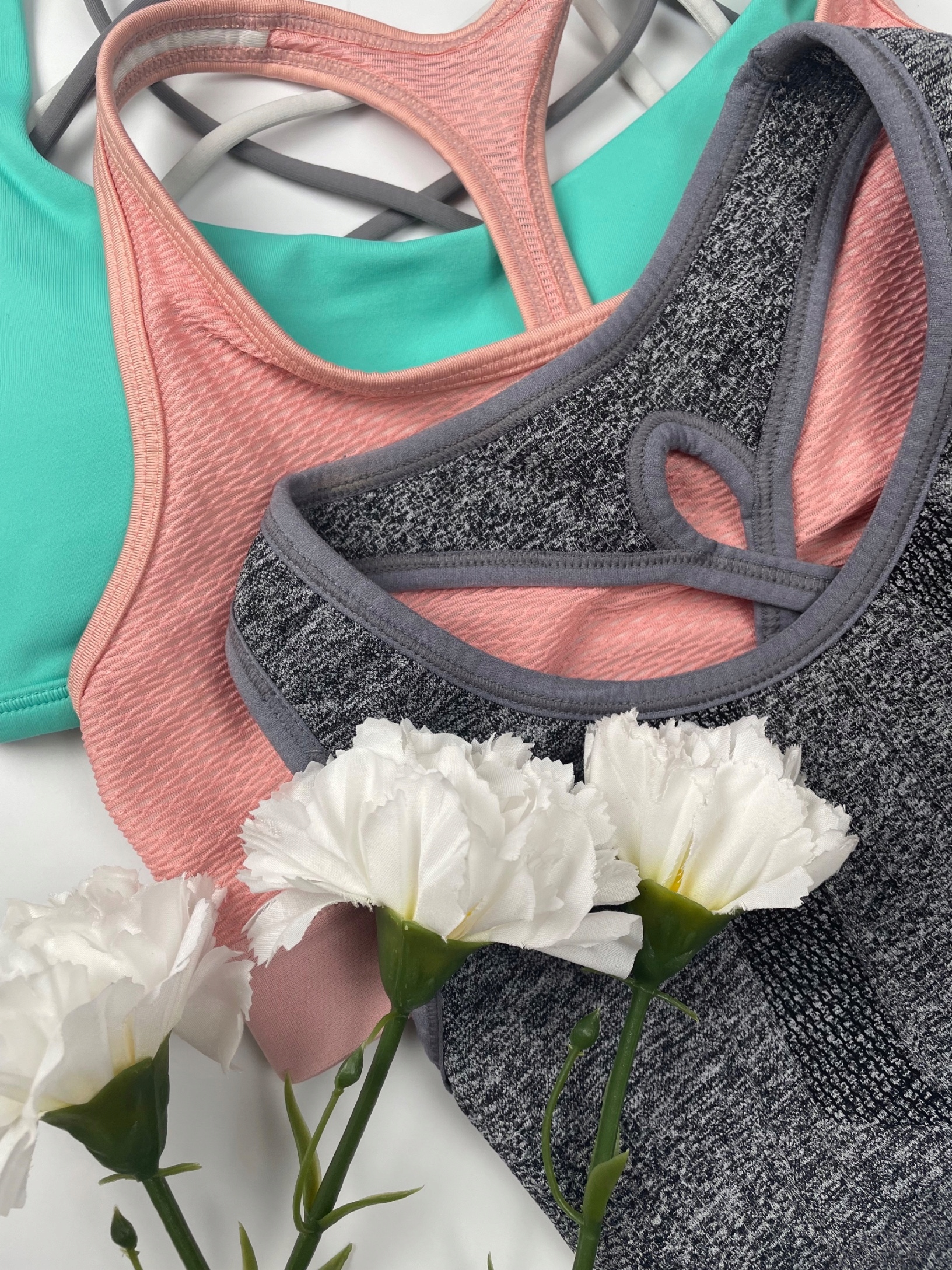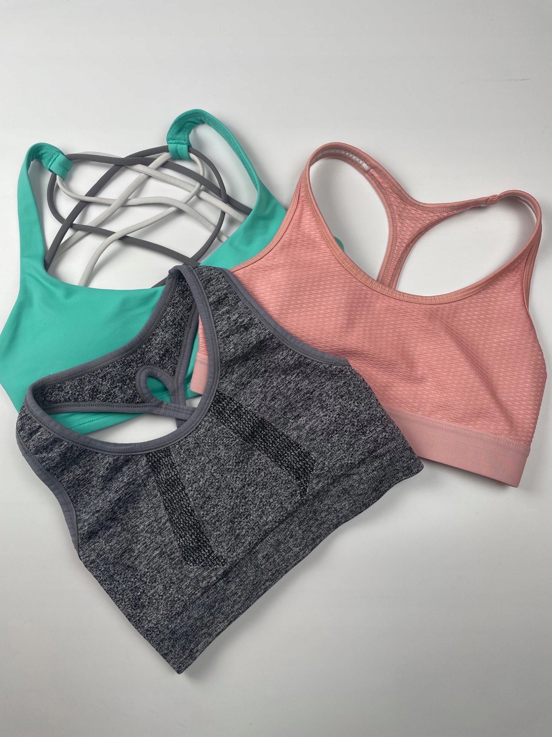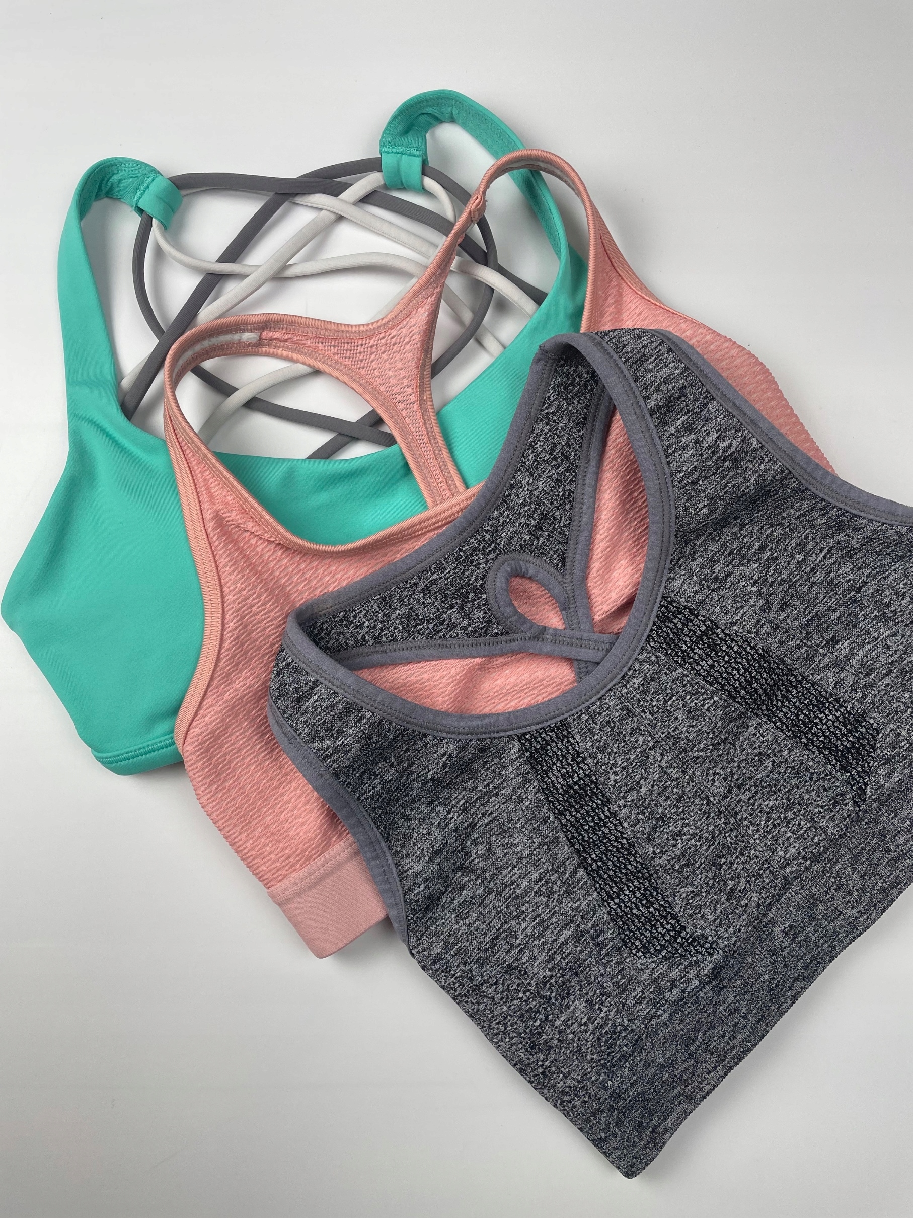 - Набір спортивних бюстгальтерів. Дуже гарний вибраний колір. Усі бюстгальтери мають трохи товстіші ремінці та вирізання типу боксера. Один із бюстгальтерів, що посилили чашки.