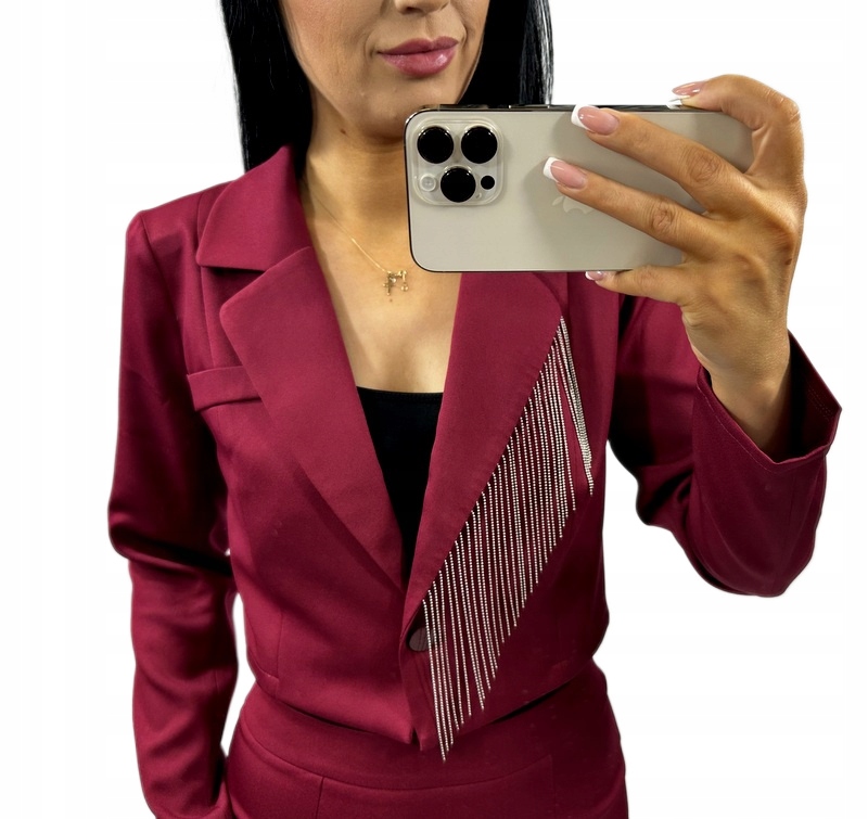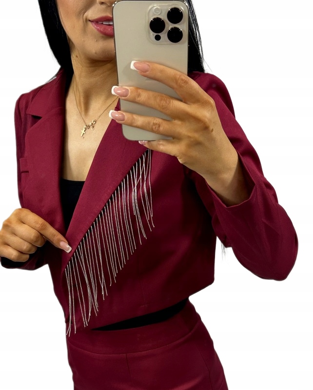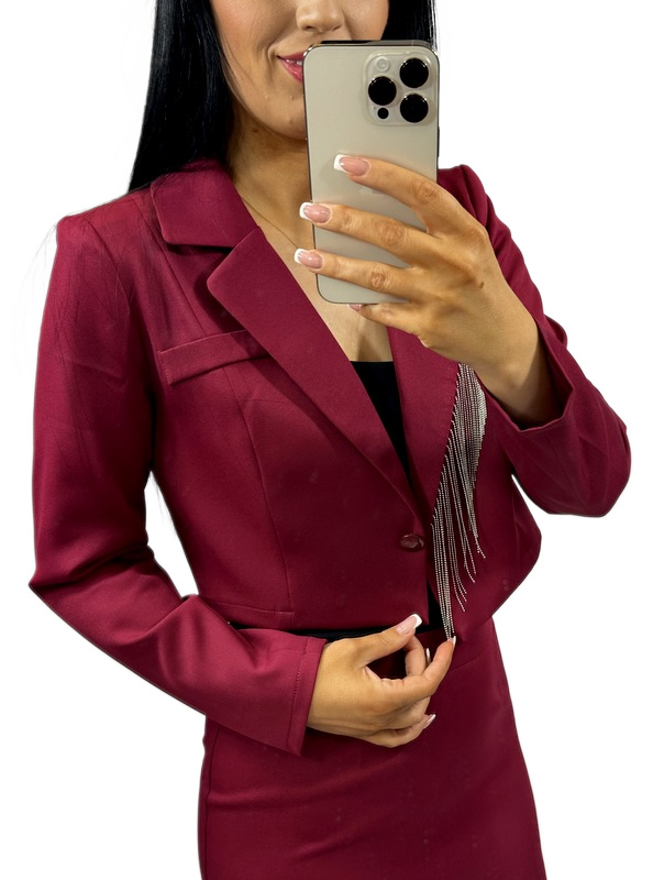- Блейзер з коміром, декорованим вшитою стрічкою з металевою бахромою
