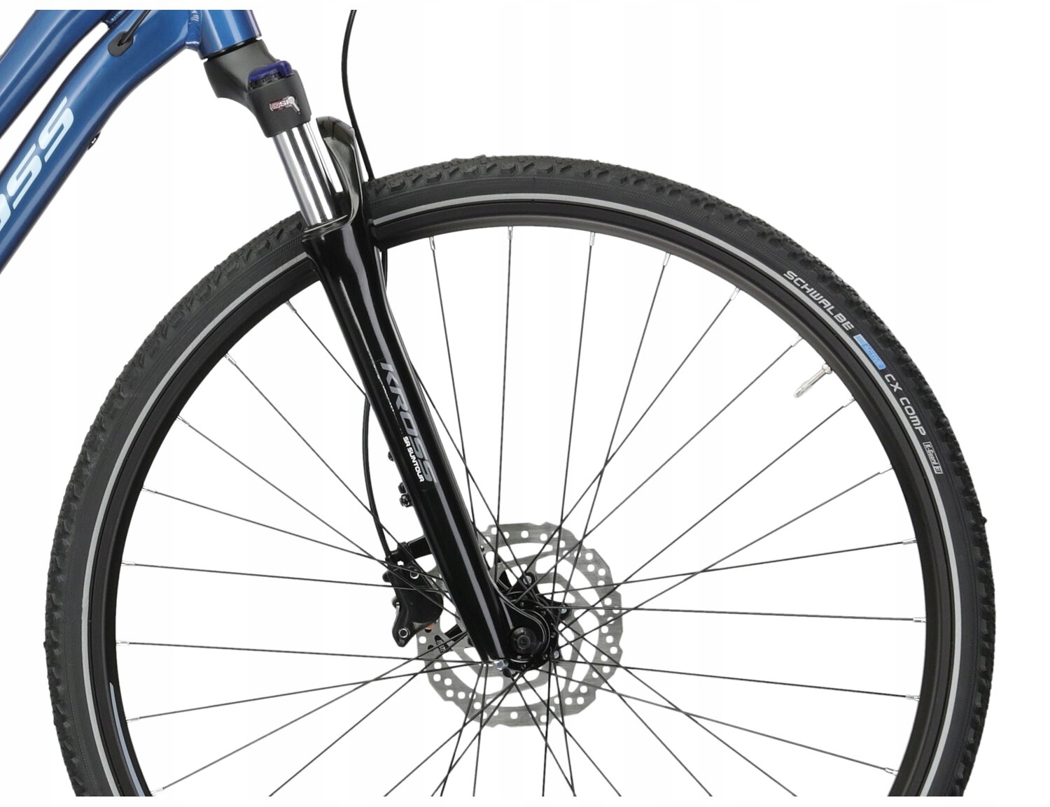 У KROSS Evado 6.0 ми використовували амортизатор SR Suntour NEX HLO. Щоб підвищити його корисність і підвищити ефективність педалювання на рівних ділянках маршруту, в короні амортизатора є замок, який дозволяє зробити вилку жорсткішою. Ви також знайдете 28-дюймові колеса та шини Schwalbe CX Comp шириною 40 міліметрів. Вони забезпечать вам відмінне зчеплення навіть на мокрій поверхні.