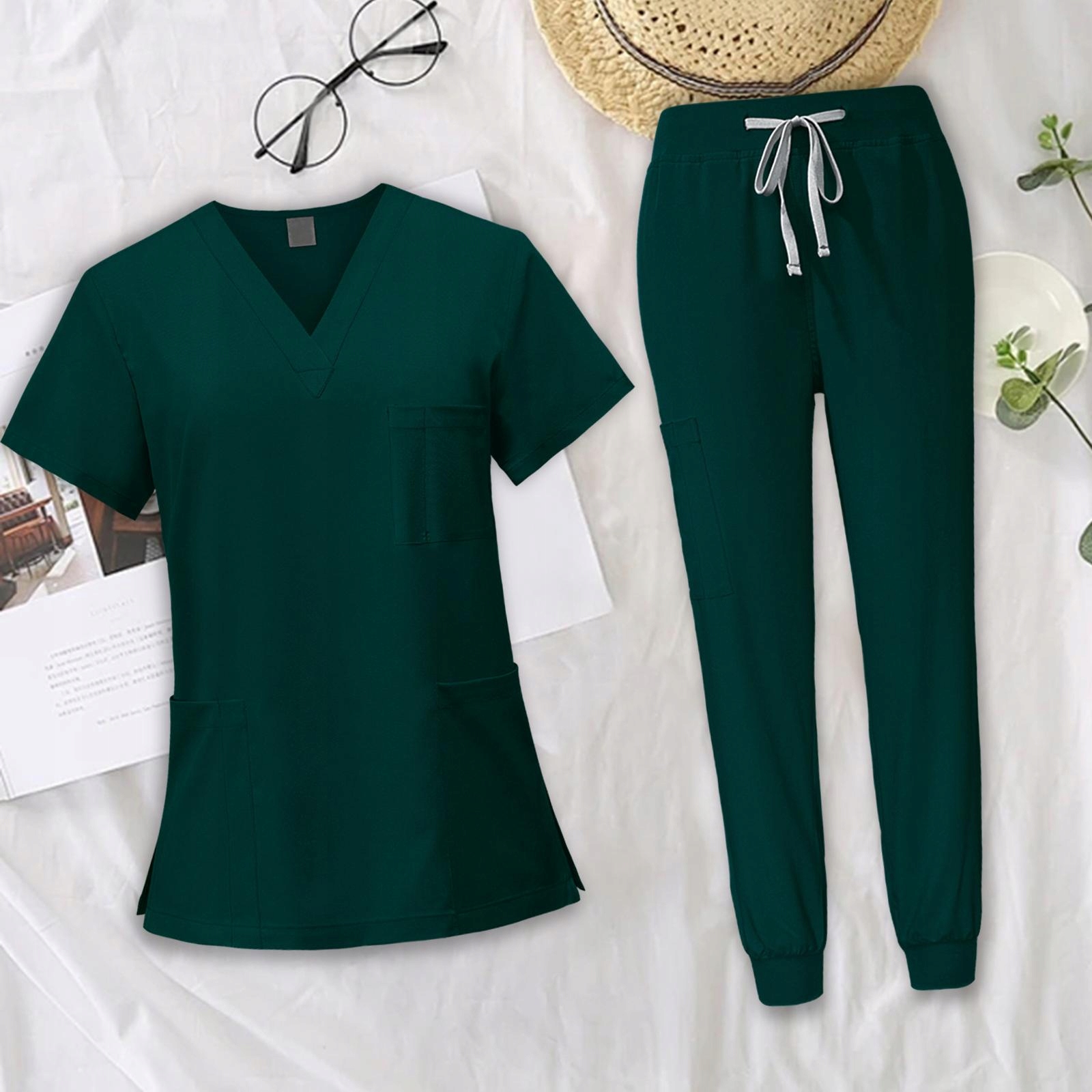 [Хірургічний комплект одягу]: жіночий хірургічний комплект одягу, топ з V-подібним вирізом з короткими рукавами, штани для бігу на еластичній талії, простий однотонний колір, вільний дизайн, повсякденний і красивий.
