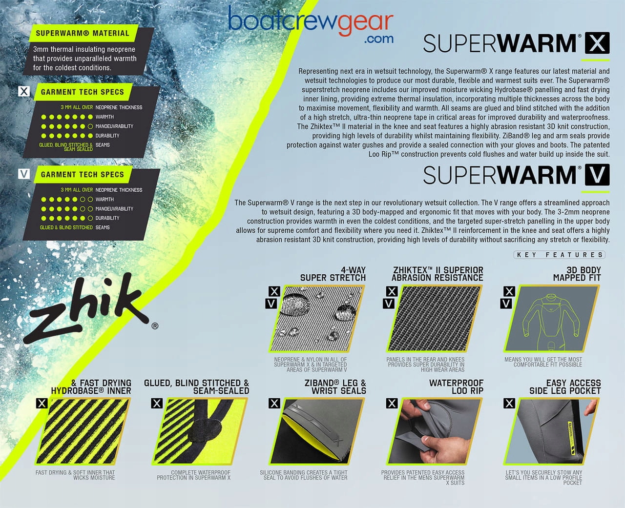 Діапазон Superwarm® X включає новітні технології тканини та піни для створення найміцніших, гнучких і найтепліших костюмів. Має внутрішню частину Hydrobase® із покращеним відведенням вологи та внутрішню підкладку, яка швидко висихає, для надзвичайної теплоізоляції, максимальної гнучкості та тепла. Усі шви проклеєні та прошиті з додаванням дуже тонкої, високорозтяжної неопренової стрічки в критичних місцях для додаткової міцності та водостійкості. Матеріал Zhiktex™ II у колінах і сидінні забезпечує високу стійкість до стирання та довговічність, зберігаючи при цьому гнучкість. Ковпачки ZiBand® забезпечують захист від впливу води та щільне з’єднання з взуттям. Запатентована конструкція Loo Rip™ запобігає накопиченню води всередині костюма. Розроблений за найвищими стандартами та оснащений усіма функціями, необхідними для комфорту, тепла та комфорту. Це найкращий вибір для спортсменів, яким потрібне найкраще спорядження.