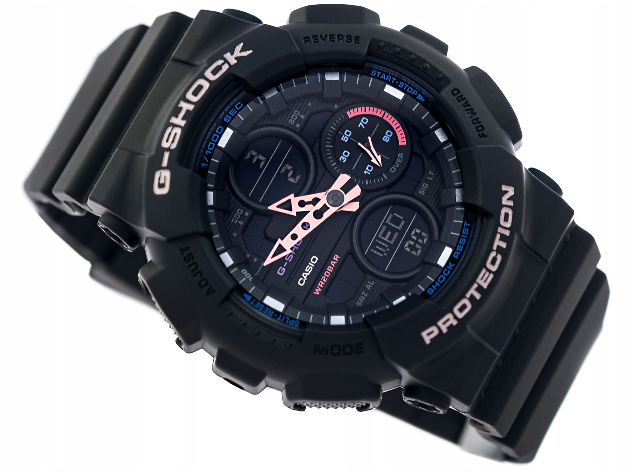 Новенький оригінальний Casio G-SHOCK GMA-S140 1AER виготовлений зі зручного чорного пластику. Циферблат має кольорові акценти, які роблять цю модель унікальною.