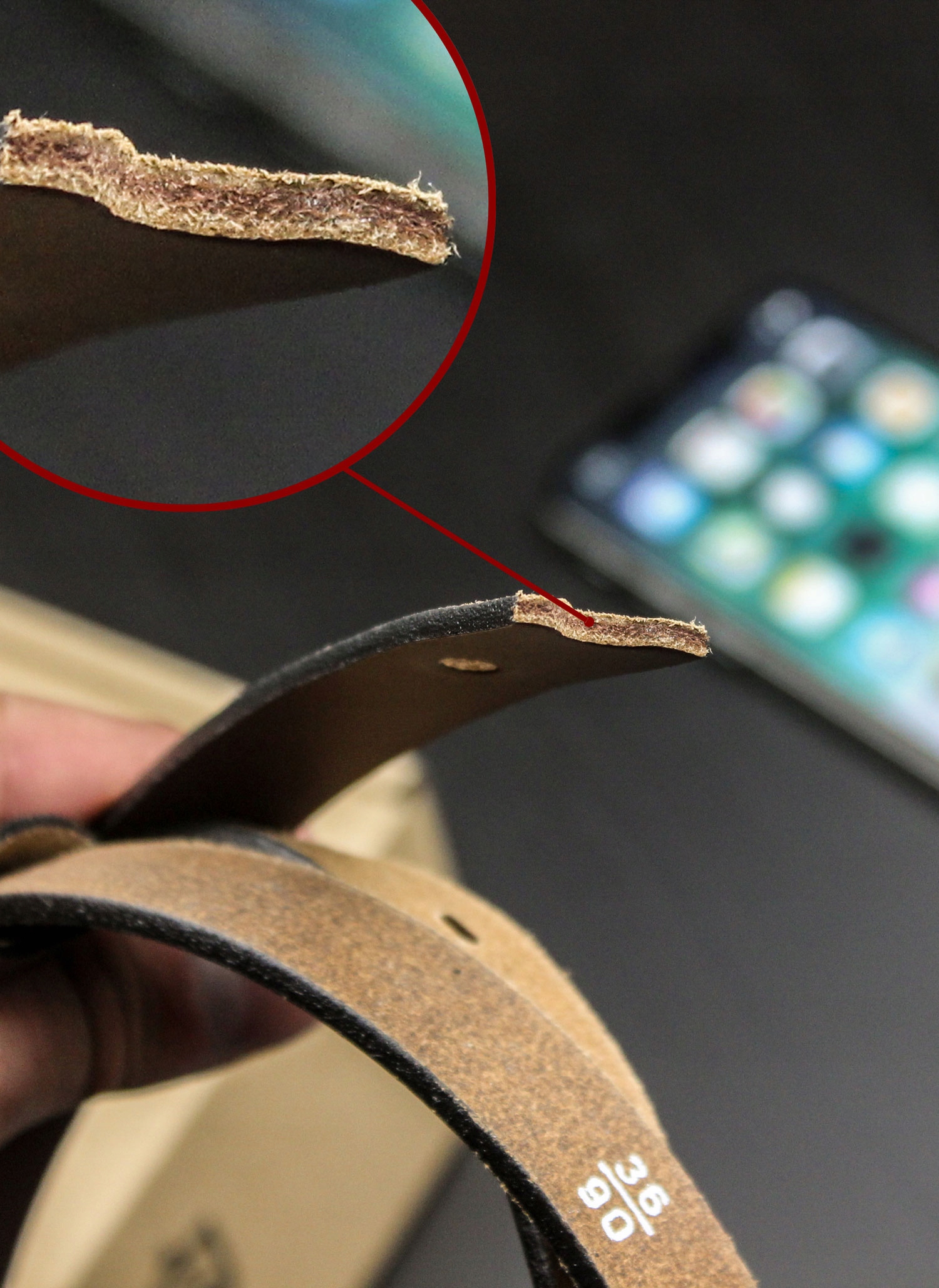 Щоб перевірити якість шкіри, необхідно перевірити її поперечний переріз. У ременях Stevens шкіра вирізана з цільного шматка, без штучних шарів або наповнювачів всередині.