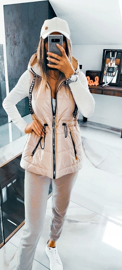 - Стьобана жилетка з декоративною стрічкою, злегка асиметрична.