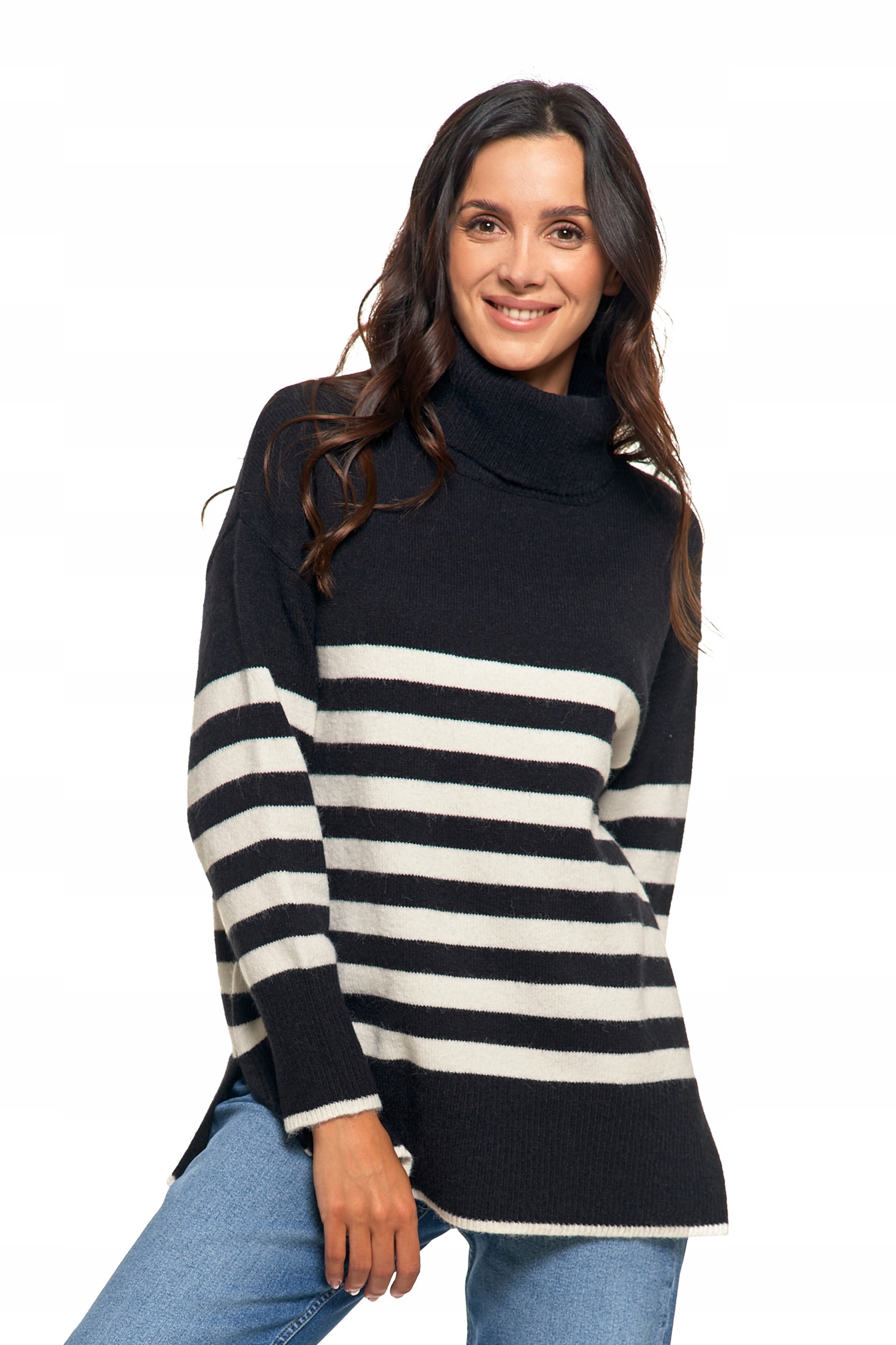 Зроблений з м'якого трикотажного одягу, светр характеризується пухким розрізом, що забезпечує свободу руху та комфорт носити цілий день. Класичний візерунок з горизонтальними смужками додає светру модного, випадкового персонажа, що робить його чудовим як у повсякденному, так і в елегантних стилізаціях. Гольф забезпечує додаткове тепло, водночас підкреслюючи стильний вигляд. Більш довгий поріз светра робить його ідеально відповідати як джинсам, так і легінсам, при цьому гарантуючи комфорт та модний зовнішній вигляд.