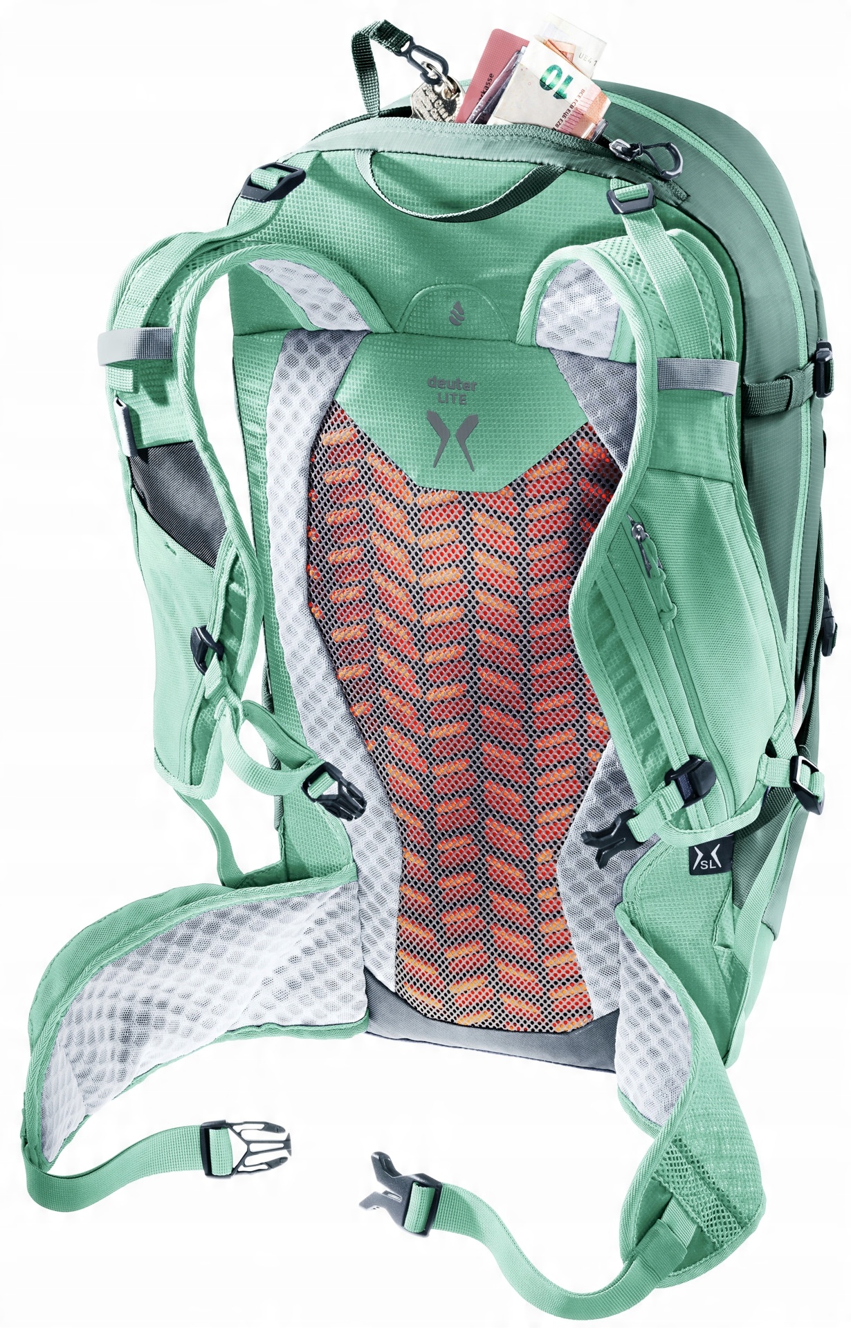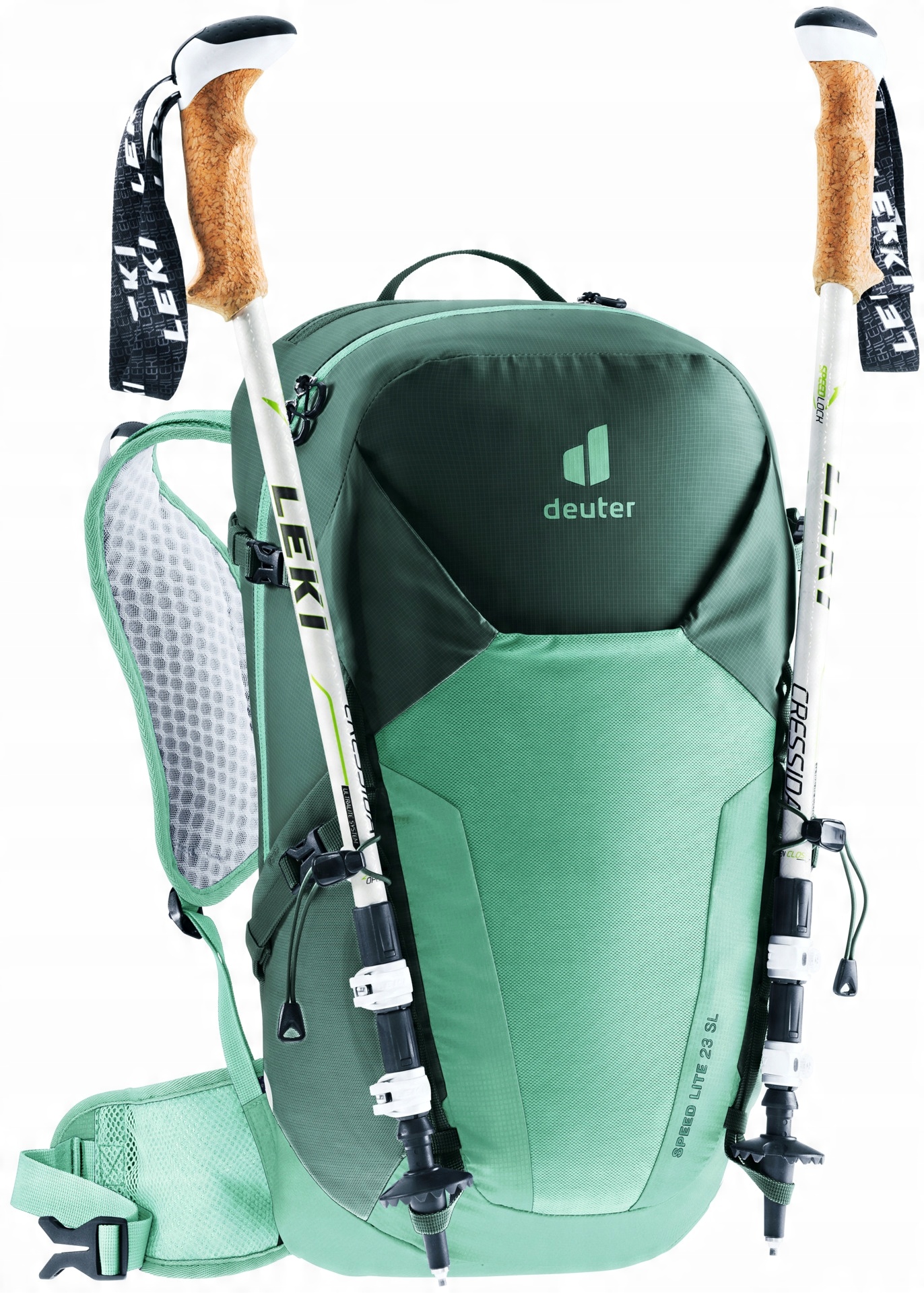 Серія рюкзаків Speed Lite характеризується надзвичайно малою вагою. Рюкзак об'ємом 23 літри важить лише 680 г, що робить його ідеальним скрізь, де ви хочете зменшити вагу свого багажу. Рюкзак з маркуванням Deuter SL (Slim Line) розроблений спеціально для жінок - коротша система носіння і вужча ремені для носіння краще адаптуються до анатомічної будови жінки, що забезпечує високий комфорт використання навіть під час інтенсивних тренувань. Задня панель покрита сіткою 3D Air Mesh, яка ефективно відводить зайву вологу, зберігаючи спину сухою довше. Рюкзак добре сидить по фігурі, дозволяючи безпечно перевозити дрібний і середній багаж. Рюкзак Deuter Speed Lite додатково стабілізований регульованим стегновим ременем і нагрудним ременем. Стегновий ремінь можна повністю зняти, що буде особливо важливо для людей, для яких важливий кожен грам. Deuter Speed Lite 23 SL - це рюкзак, який, незважаючи на невеликі розміри, має містке основне відділення, в якому поміститься все необхідне спорядження для одноденного походу. Бренд Deuter оснастив свій туристичний рюкзак плоскою кишенею для 3-літрової ємності для води. Можливість використовувати водяний міхур полегшує нам бути активними, оскільки ми можемо пити воду, не зупиняючись. Дві бічні еластичні кишені вміщають запасну пляшку води або закуски, які ви хочете мати під рукою. У туристичному рюкзаку Deuter також є додаткова кишеня для цінних речей або телефону. Ви подорожуєте в темряві? Не хвилюйтеся, рюкзак Deuter Speed Lite 23 має світловідбиваючі елементи, які покращують вашу видимість. Важливим елементом екіпіровки є кріплення для трекінгових палиць, завдяки яким можна кріпити палиці в складеному вигляді під час транспортування рюкзака в автомобілі чи поїзді.