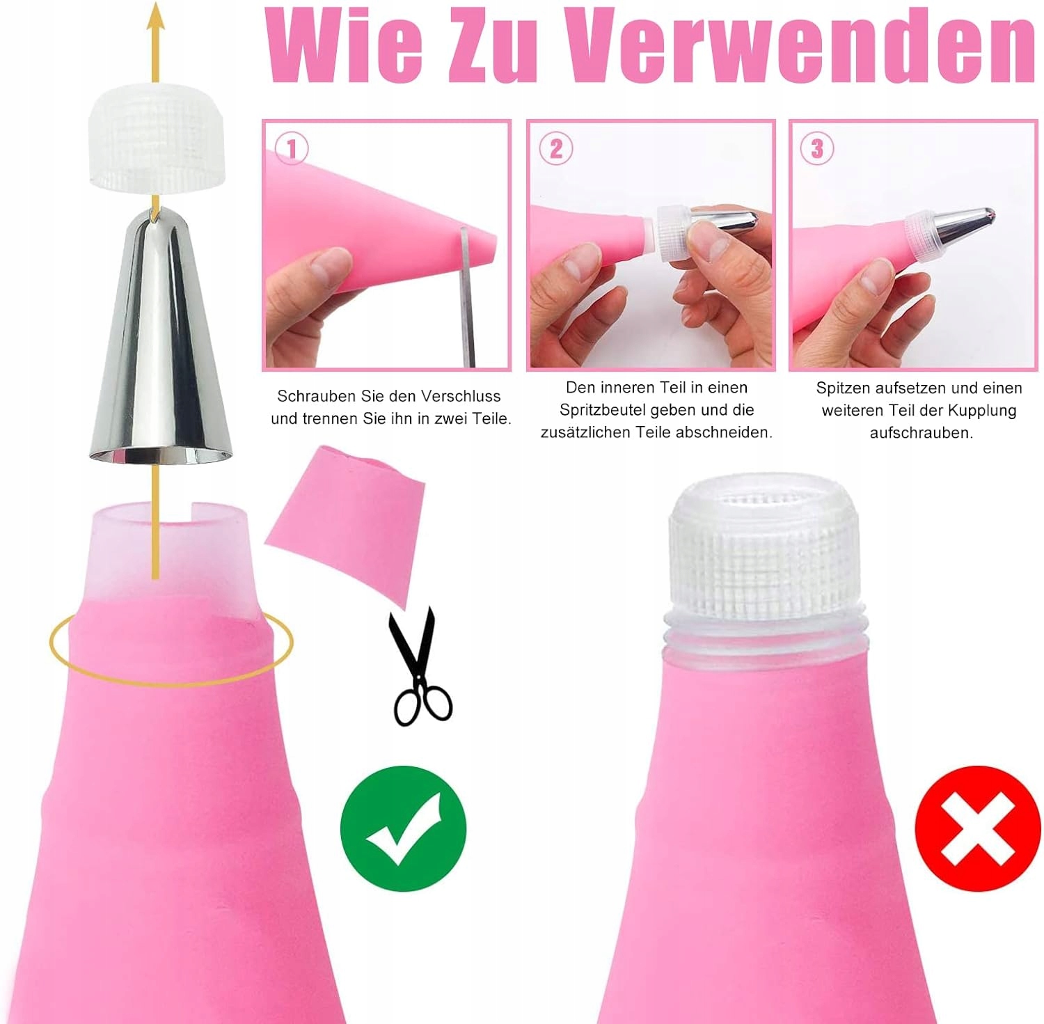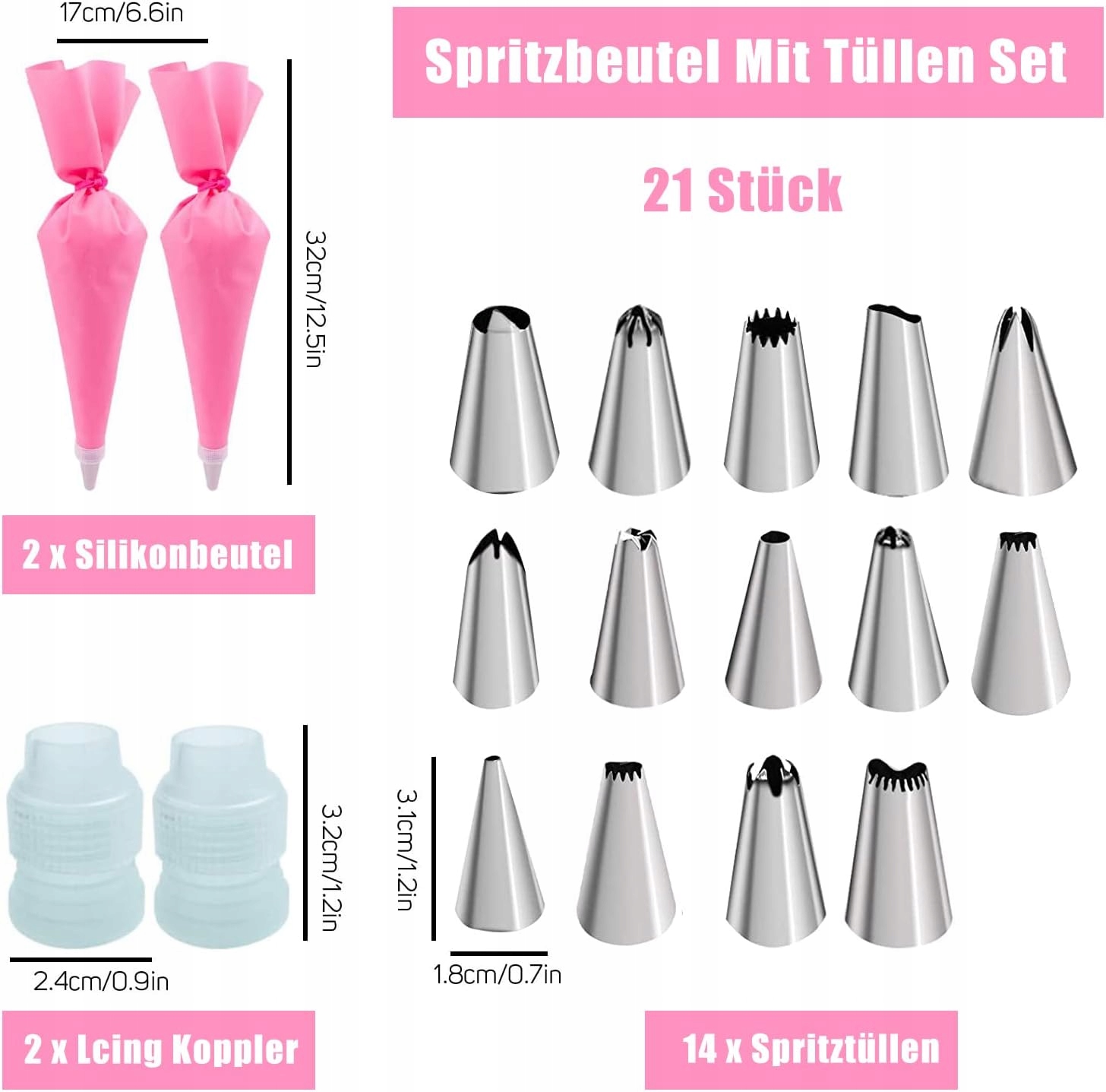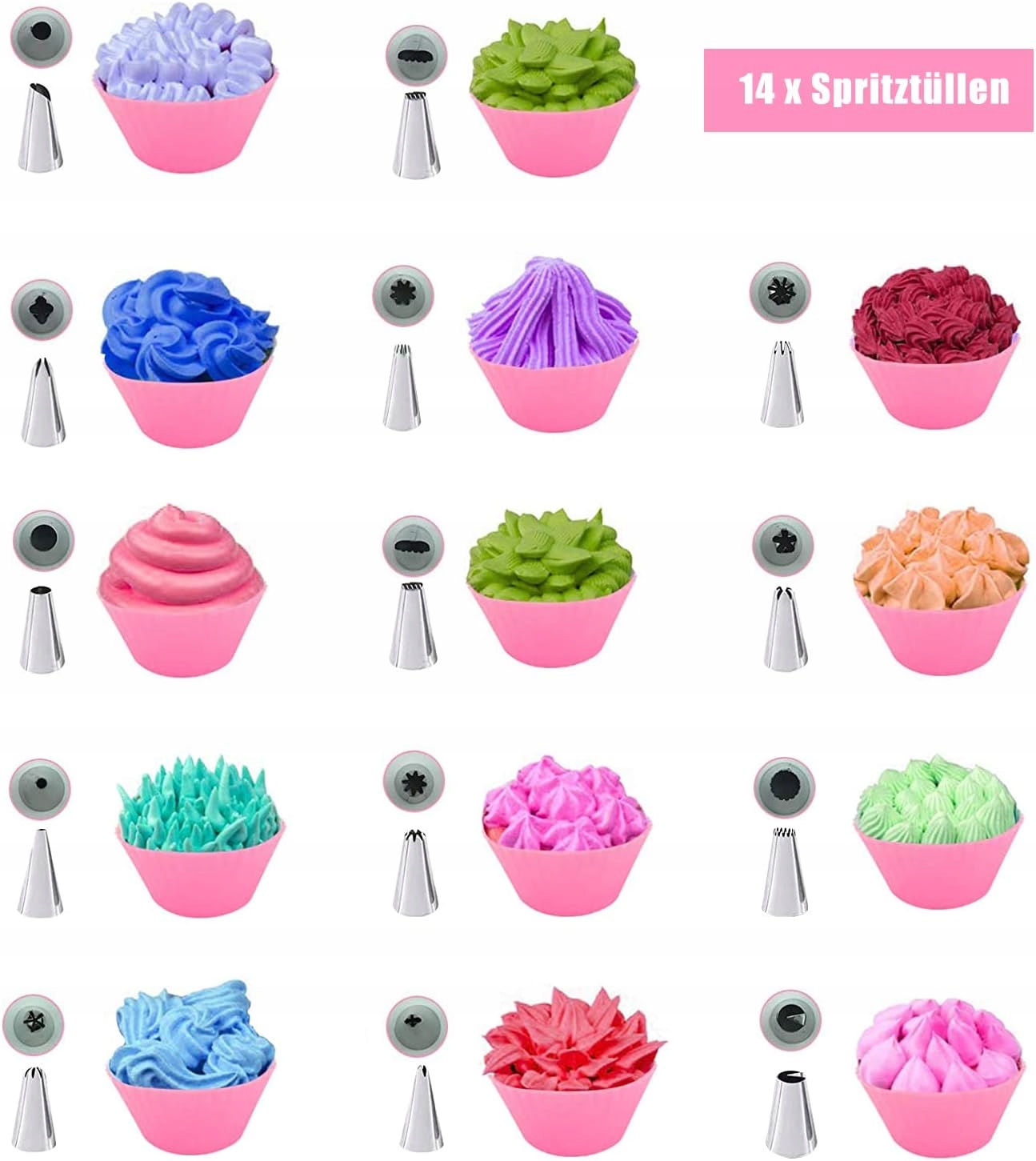 - [Надзвичайний набір] 21 кондитерська насадка, включаючи 14 насадок з нержавіючої сталі, 2 рожеві силіконові пакети, 2 стандартні конвертери, 3 рожеві кремові лопатки різної форми, придатні для професійні пекарі, любителі випічки своїми руками або діти-початківці.